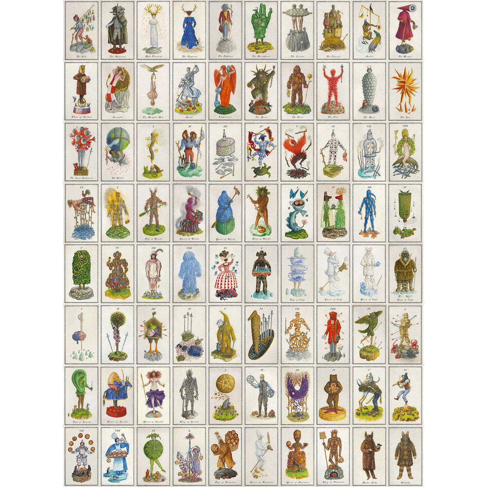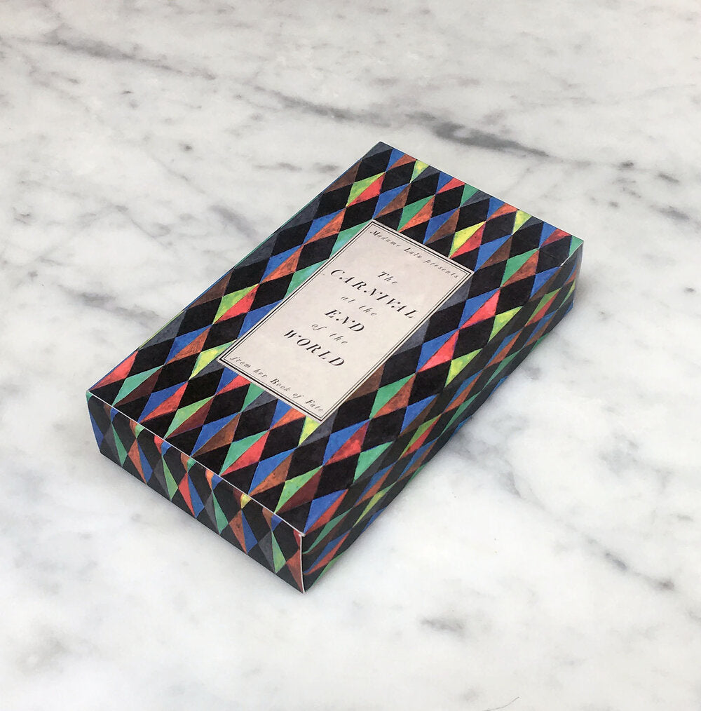Carnival at the End of the World Tarot Deck by artist duo Kahn & Selesnick is a unique divination set sure to stand out in any collection. These hand painted characters represent the full range of tarot while maintaining distinctive personality. There is a macabre tinge heralding environmental disaster and the end of the world as we know it.