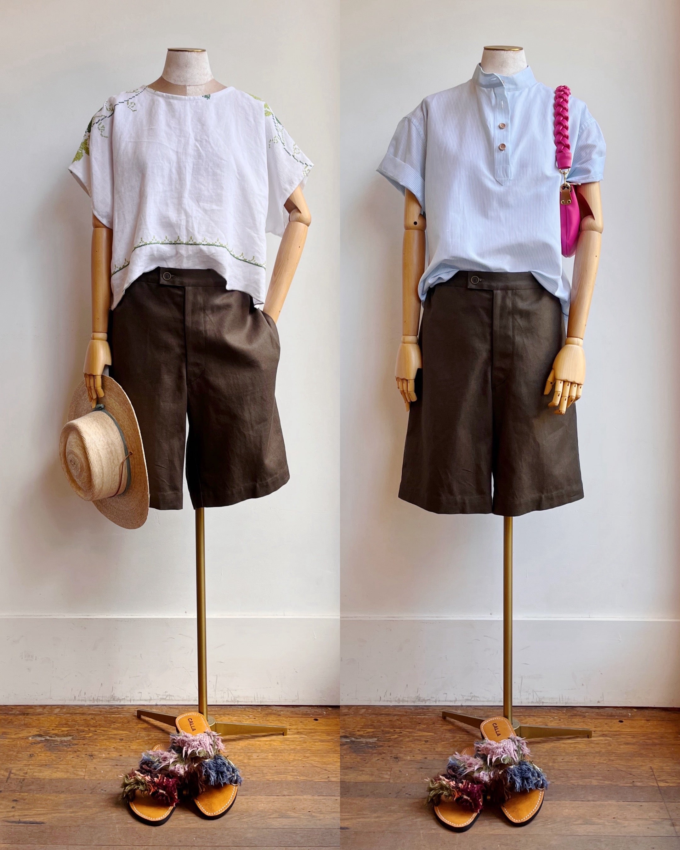 For these two outfits, we’ve paired them with a funky pair of two-strap Hali sandals from Calla for some instant personality, plus two different easygoing tops. On the left is a one-of-a-kind box top from Brosgé sewn from a vintage linen tablecloth with green embroidery. (And there are several others to choose from, each one unique.) On the right is our own short-sleeved MXH Popover top in a deadstock blue and white mini-striped cotton.