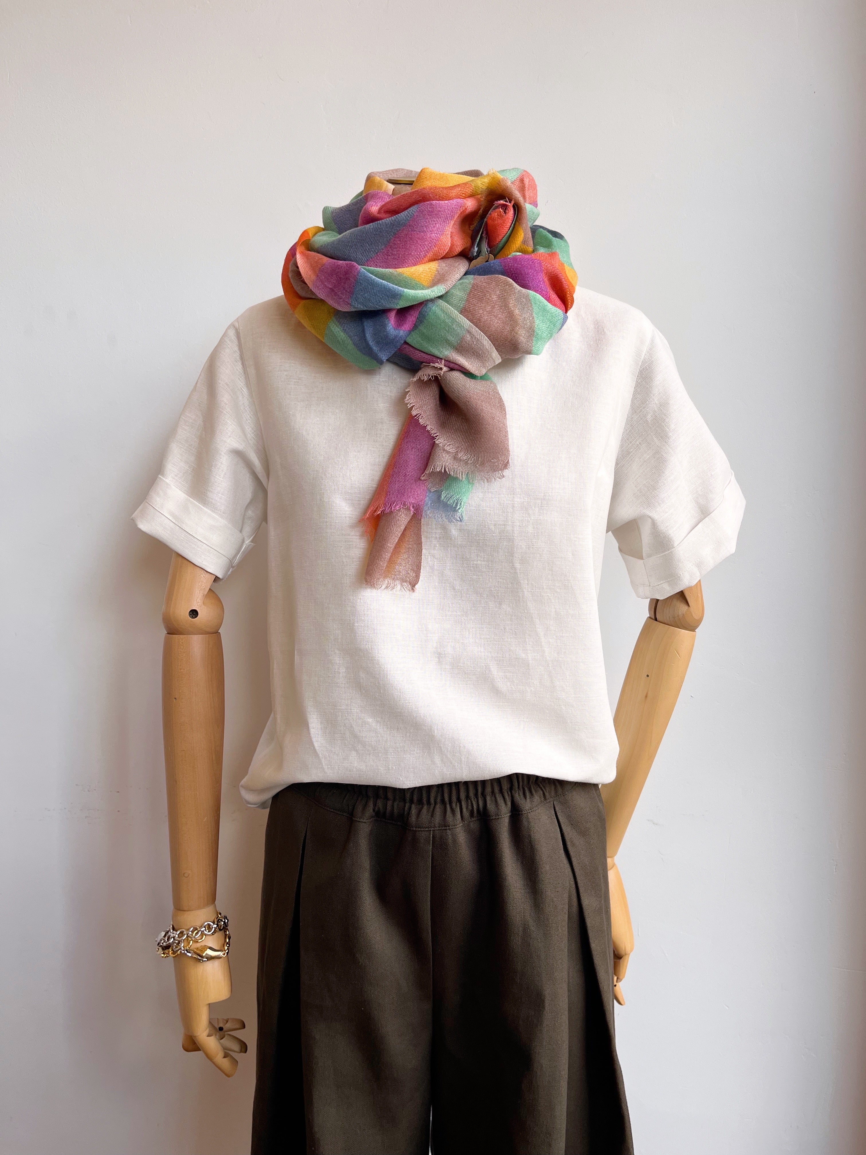 Made from an easygoing hemp-cotton canvas, our Made X Hudson Wide-Leg Pants (made above our Catskill shop) are a true four-season pant in most climates — as cute with sandals or sneakers as they are with boots or heels. We’re eager for Spring over here, so for this outfit idea, we’ve paired a moss greenish-brown pair with our easy Everyday Top in white linen, half-tucked and sleeves rolled for a more casual vibe. Then we’ve added a wool gauze scarf from our friend Language of the Birds (available in multiple prints and colorways) and shearling-lined Sabah shoes for a little reinforcement before true Spring arrives. Then we topped it all off with an extremely cute, one-of-a-kind sling bag from Upstate maker Highlands Foundry and a trio of Gentlewoman's Agreement bracelets by Saugerties jewelry designer MLE.