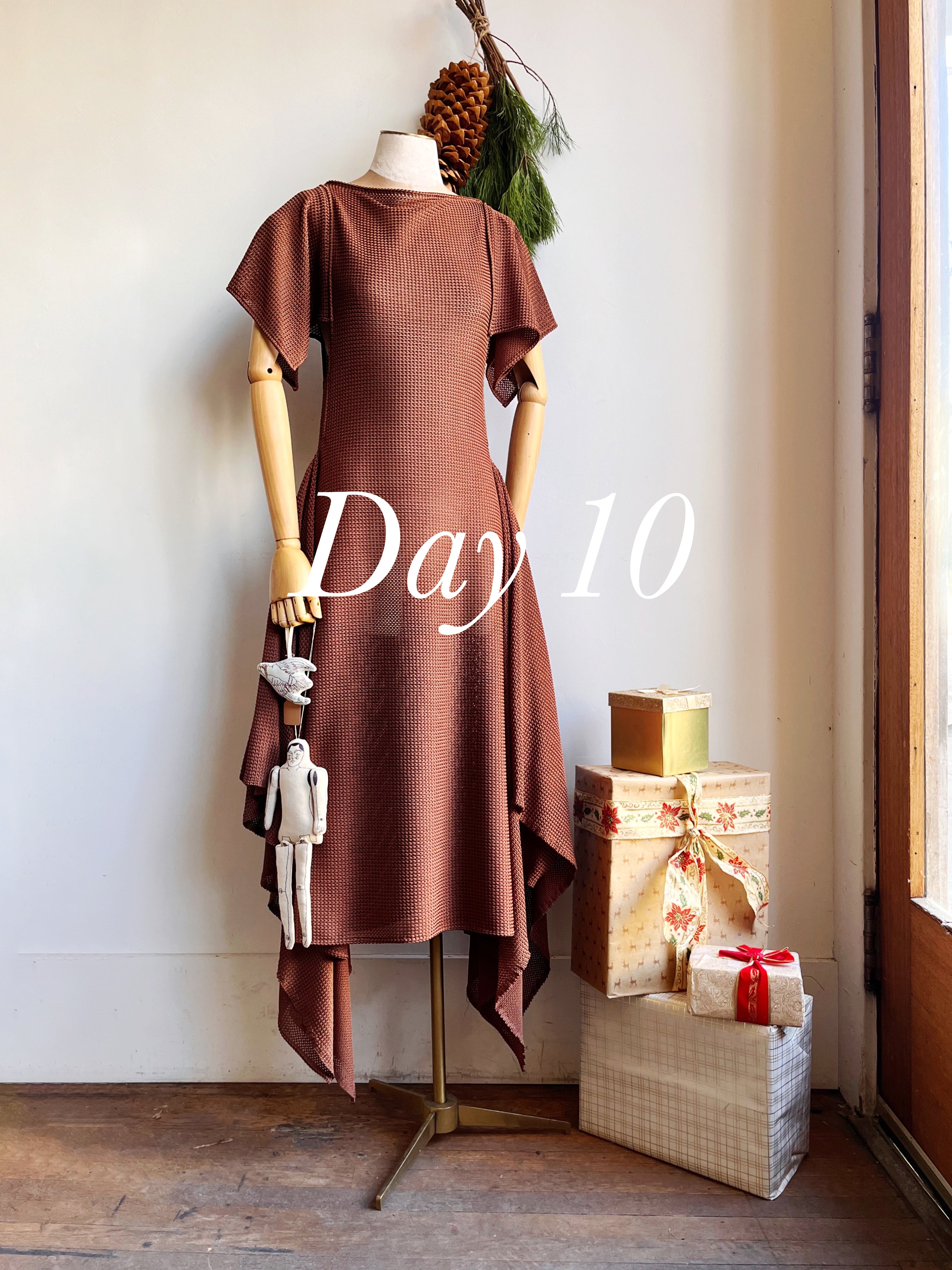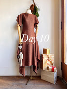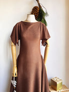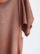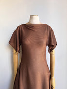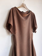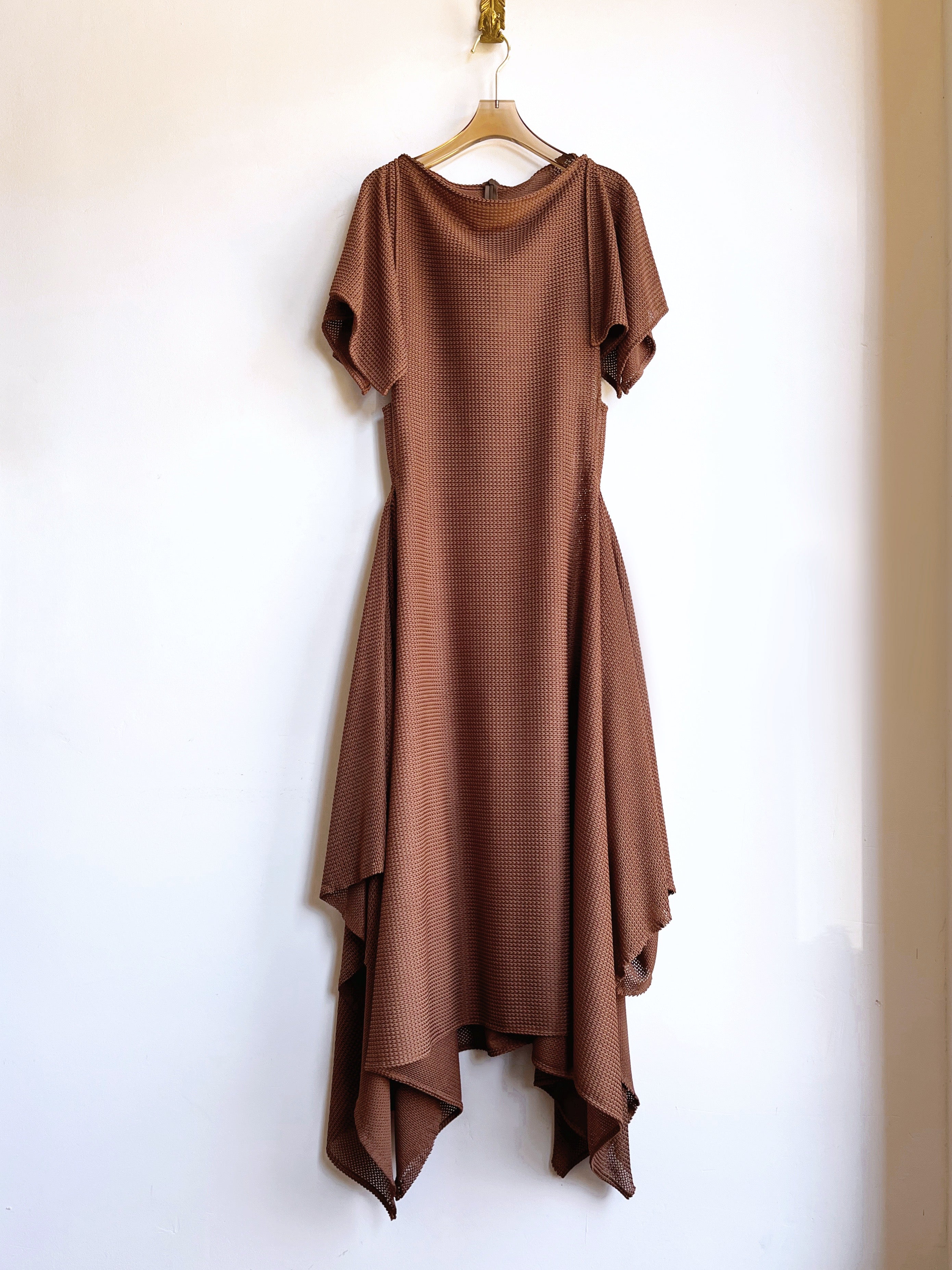 Our MXH Deco Dress is a fresh addition from our house line, born from our bestselling Zero-Waste Dress. This new style features side panels for additional coverage and a graceful rectangular flutter sleeve. The result is a modern twist on elegant Roaring Twenties glamour. This one was sewn from a beautiful deadstock semi-sheer textured knit in a rich cocoa brown. Dress it up with a slip for a party or wedding, or take to a tropical destination as a slinky coverup.