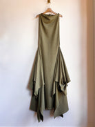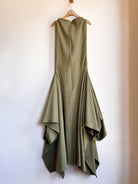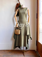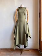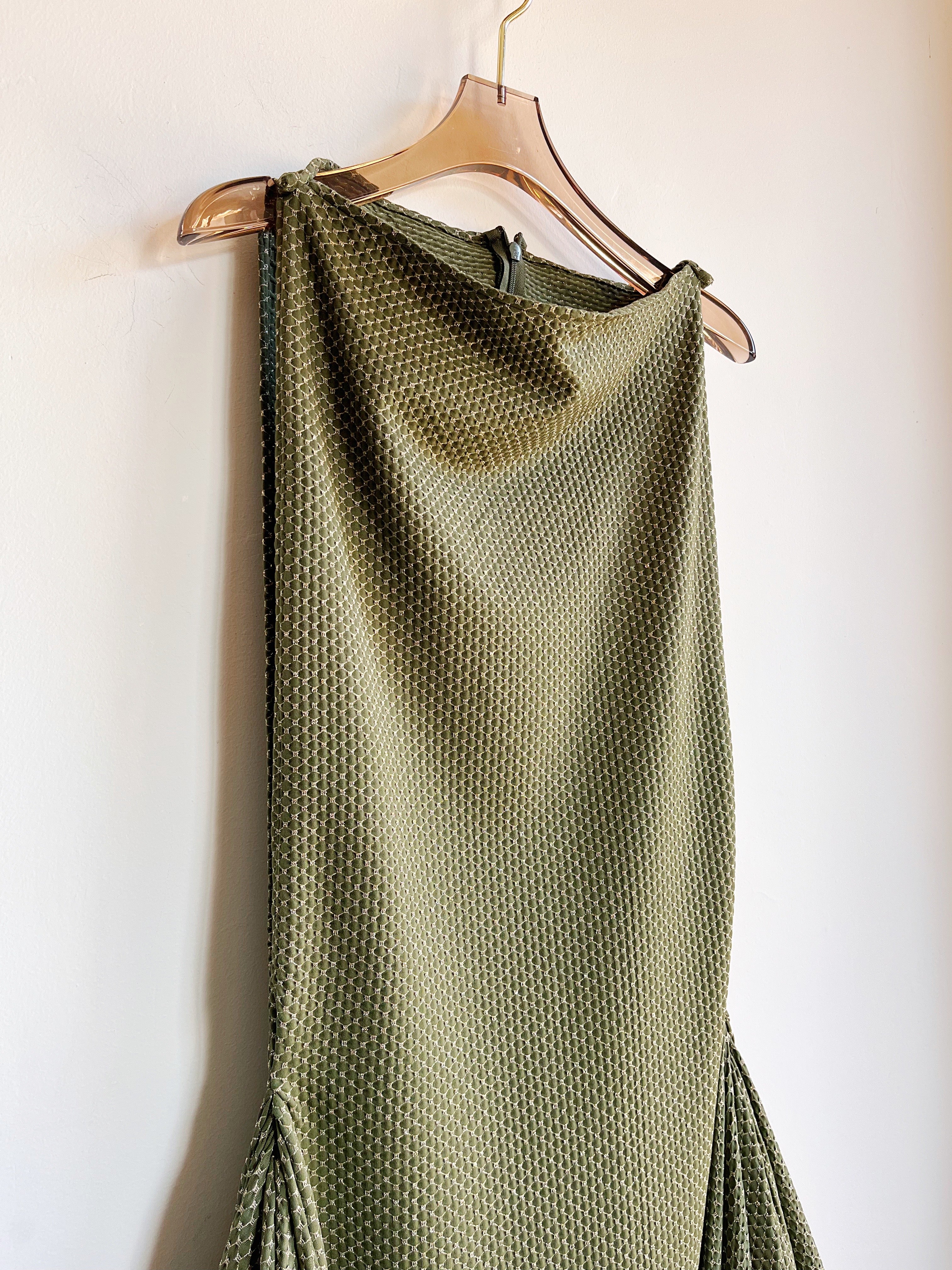 Our Zero-Waste Dress is so unabashedly pretty they tend to sell just as quickly as we can get one onto the floor. This one was sewn from a beautiful deadstock honeycomb textured green knit fabric with gold shimmer throughout. Dress it up for a party or wedding, stun your co-workers at the holiday party, or throw on a jacket and boots for a day out and about.