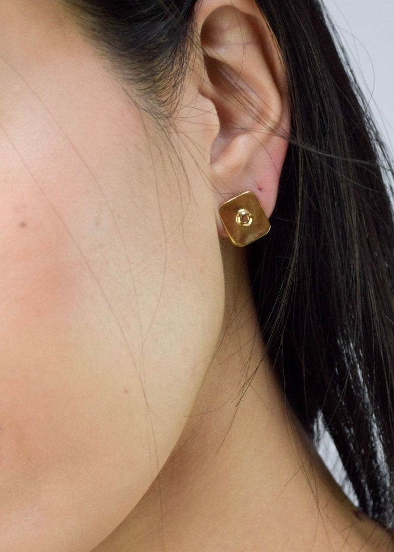 Vutot Studs by Aglaia Jewelry are minimal profile studs with a decorative pierced hole in the center of a soft brass square. Perfect for everyday wear or take these on a sophisticated night out. The artist was inspired by the relationship between 'empty' and 'full', wanting to communicate the value of what seems to be absent but, in reality, brings within itself a wide and deep symbolism.
