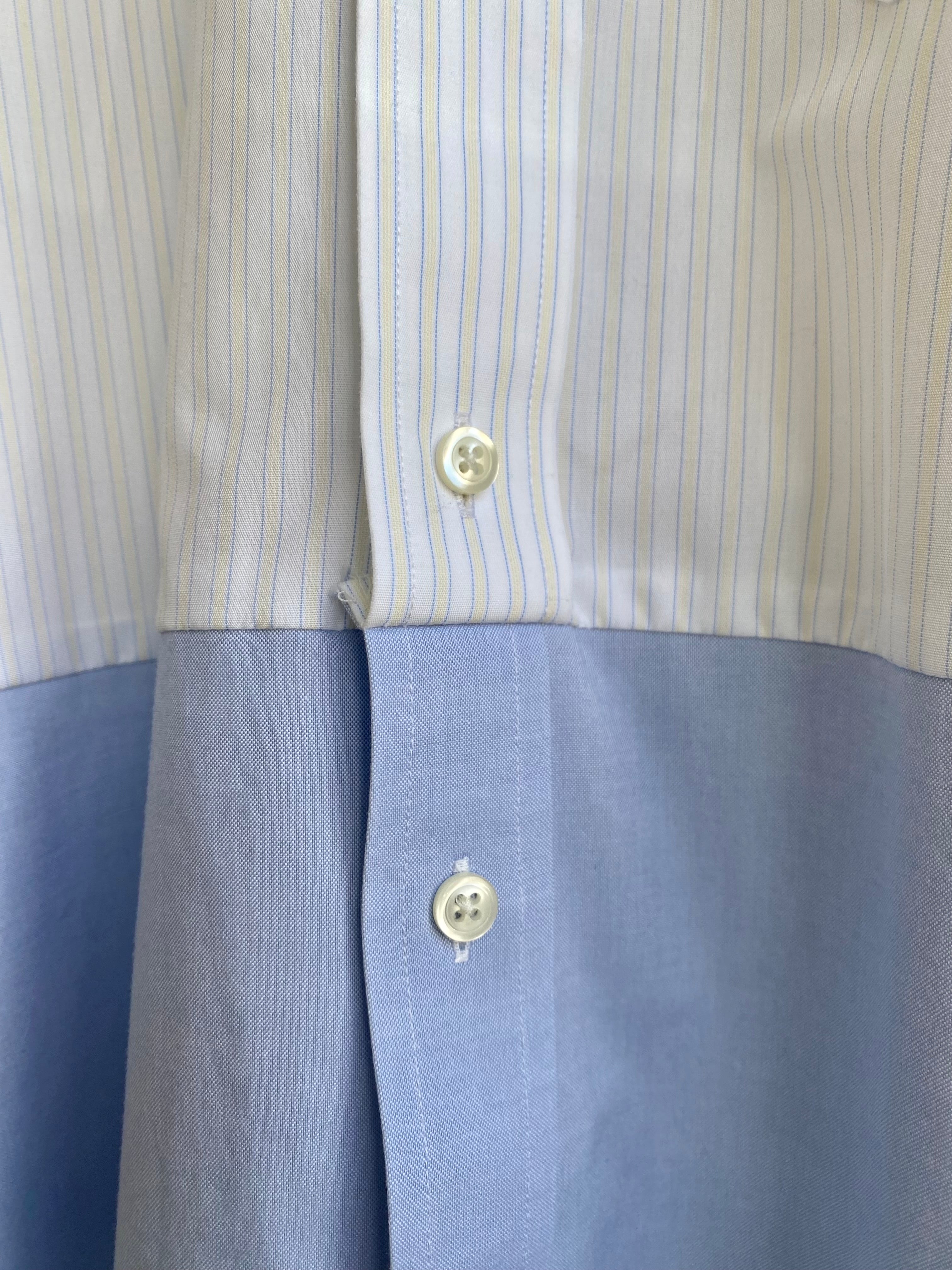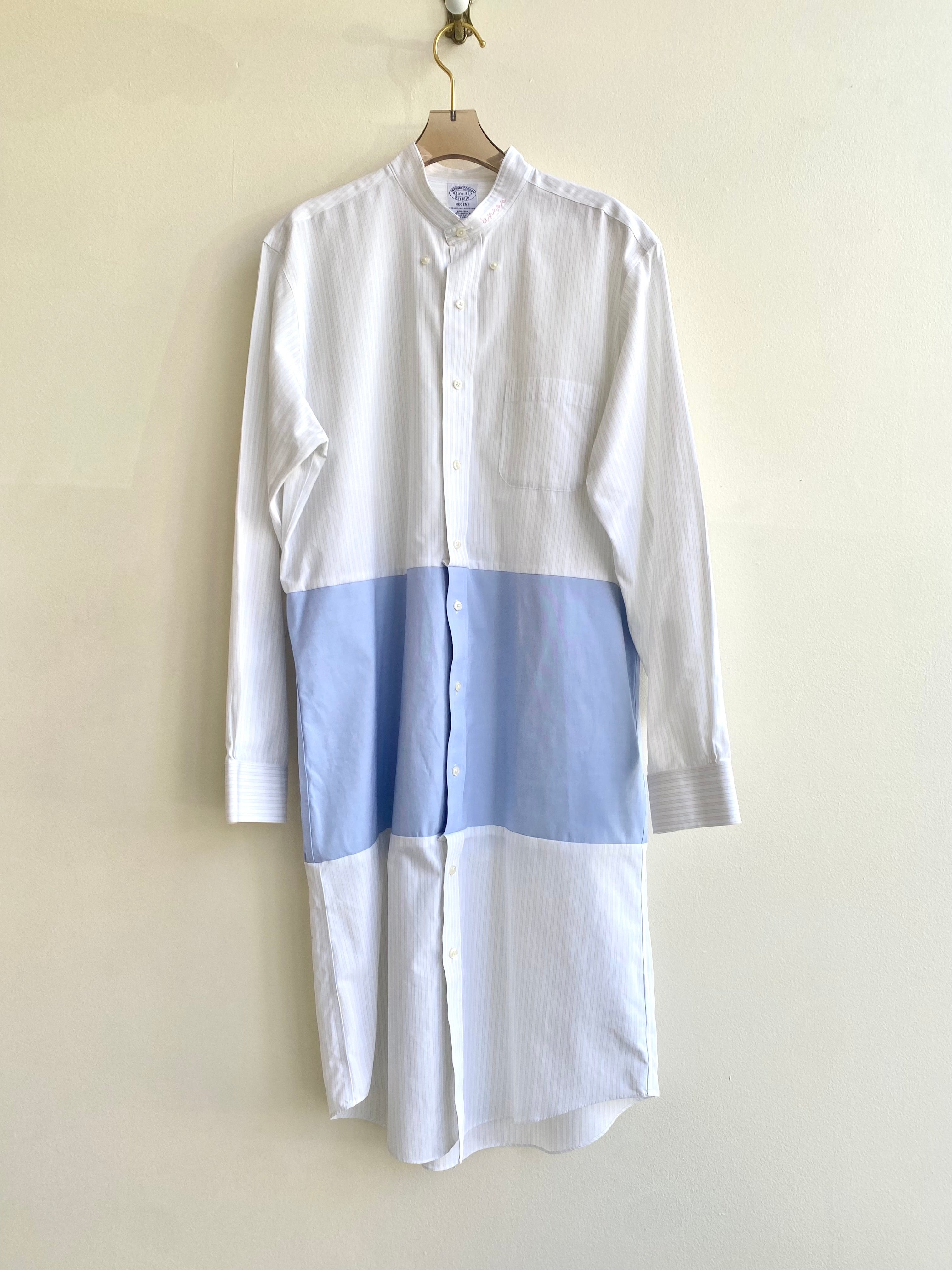 This White & Pale Yellow Pinstripe Des Dress, from Designer Apres L’Amour, is a sustainable and upcycled piece made from men’s shirting. Featuring a unique color block design, it not only helps the planet but also supports a woman-owned business. Perfect for the fashion-forward individual looking to make a statement while reducing their environmental impact.