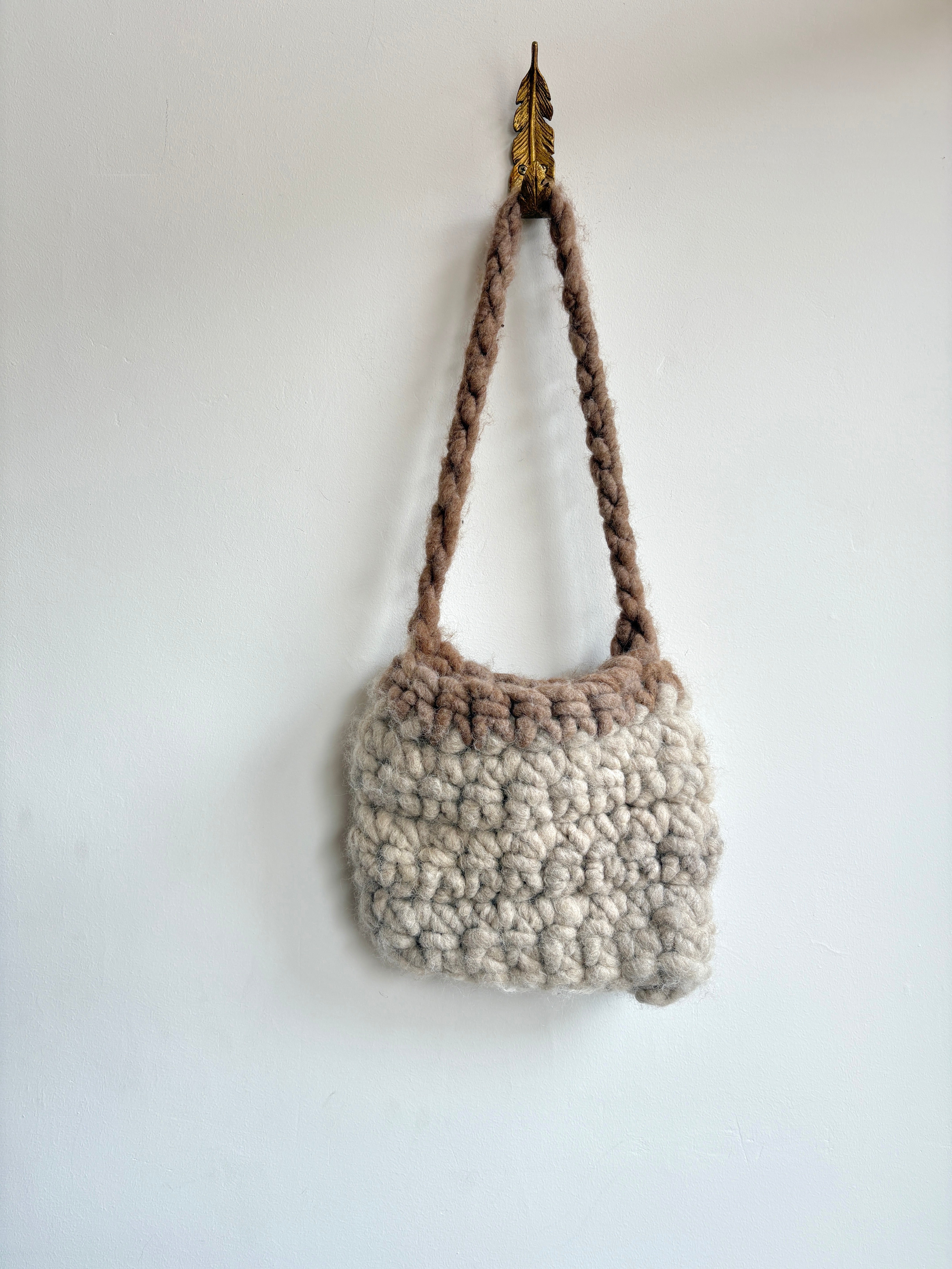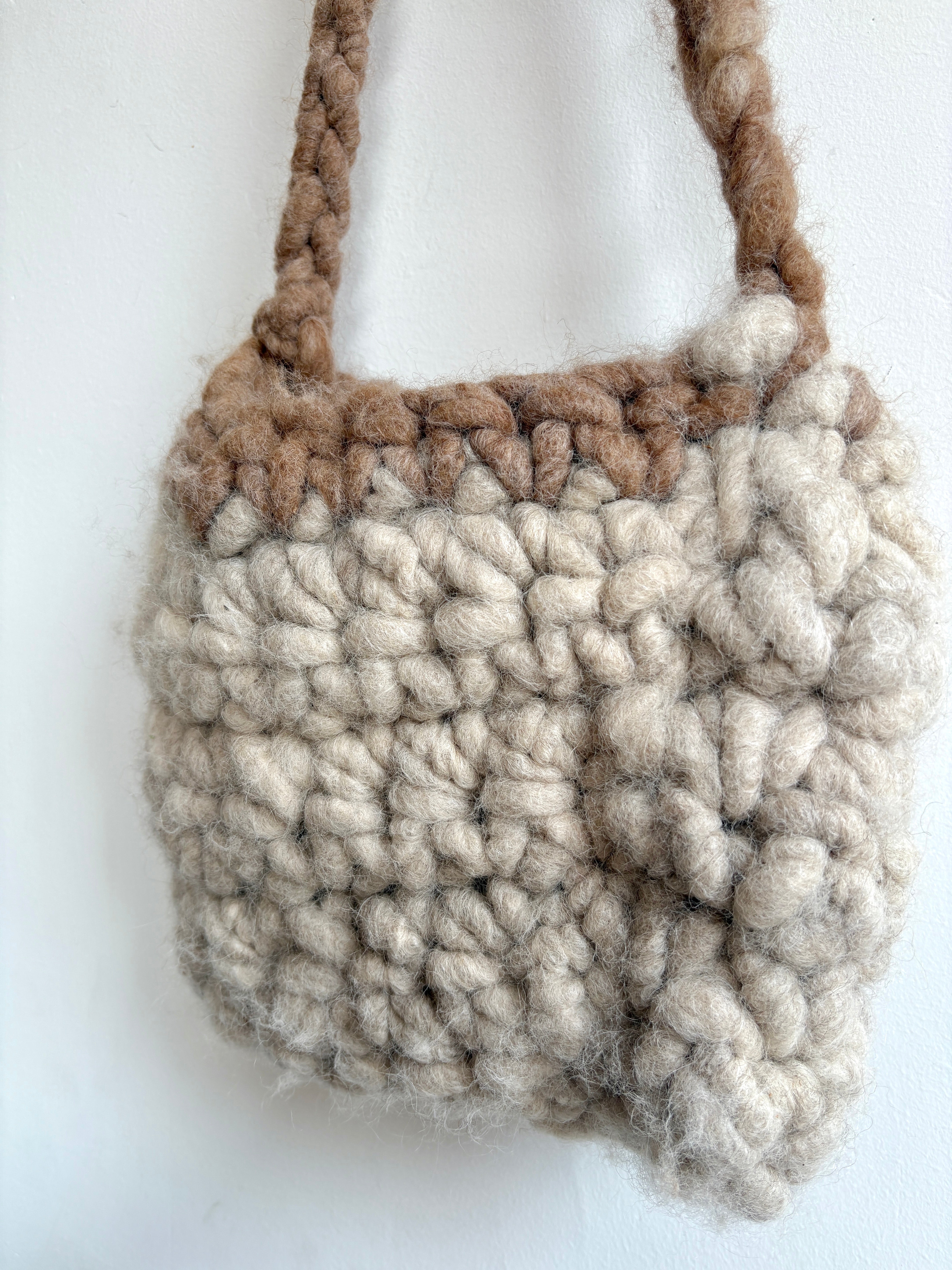 Cream and Brown Wool Fiber Handmade Crochet Bag