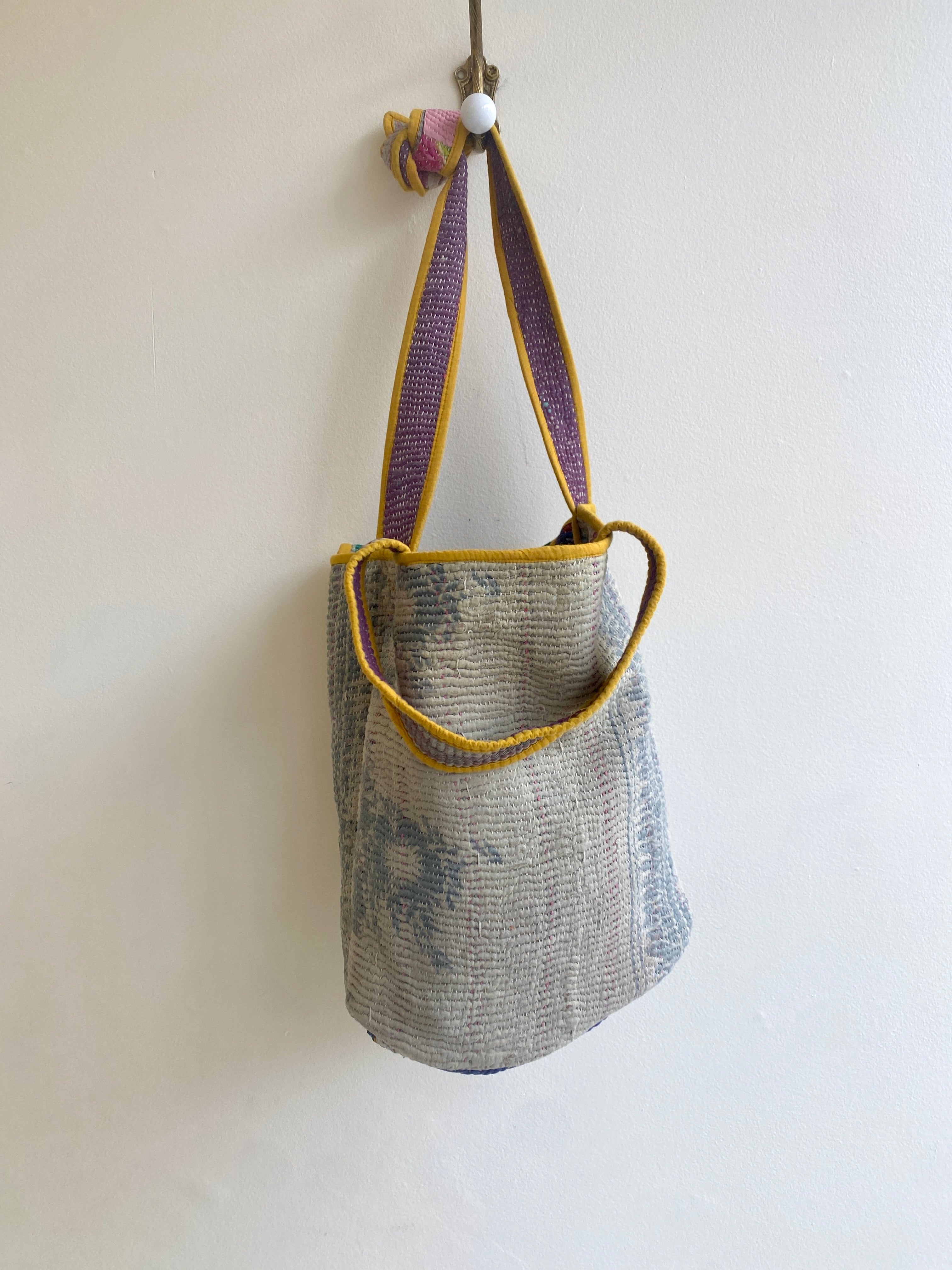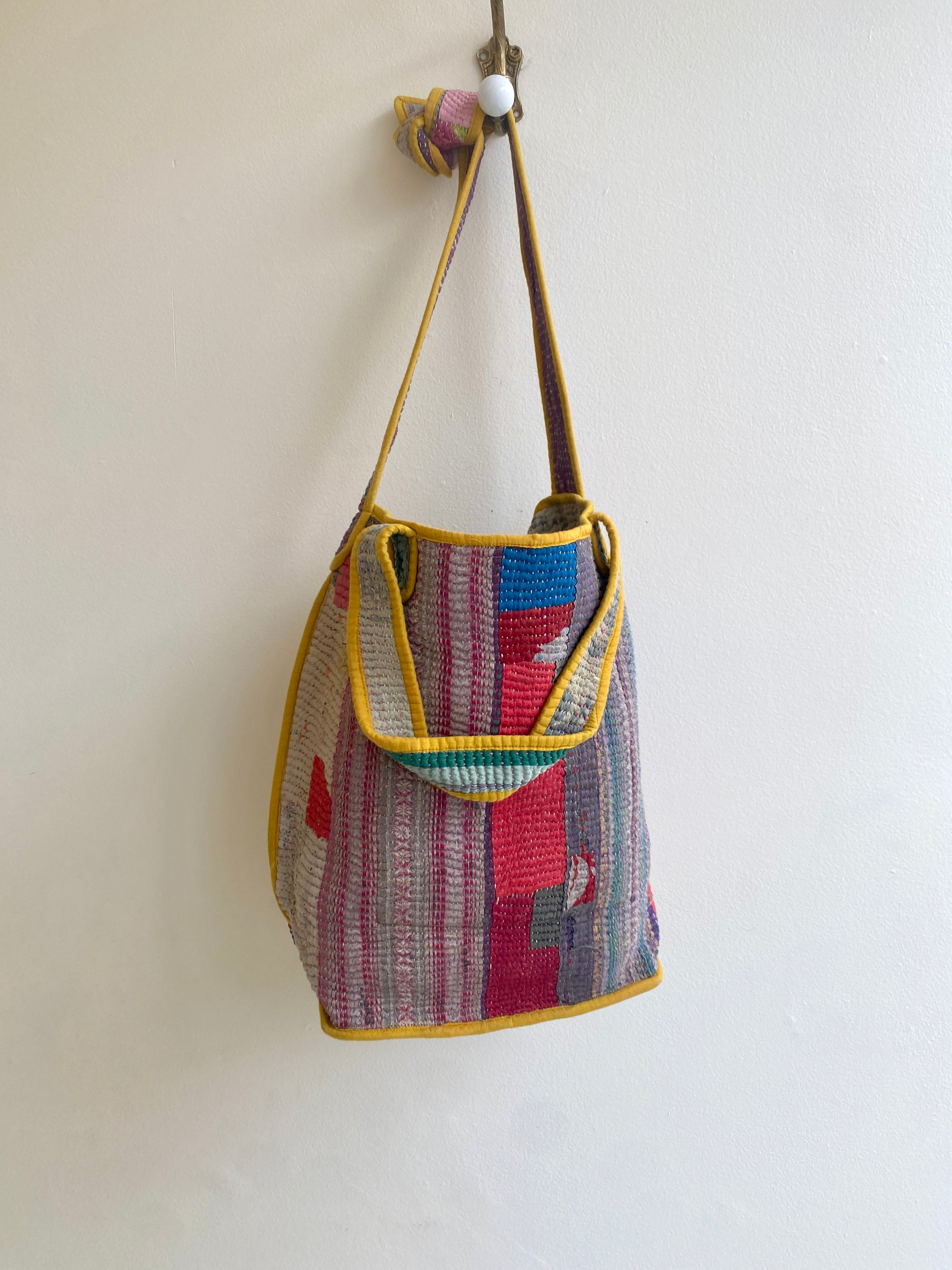 About the Textiles Used: The Xoti tote bag is made from remnants of vintage Kantha quilts that were used to make jackets and other items, for a truly zero waste product. The original patina of the fabric includes areas of fraying, patches and an age-softened feel.