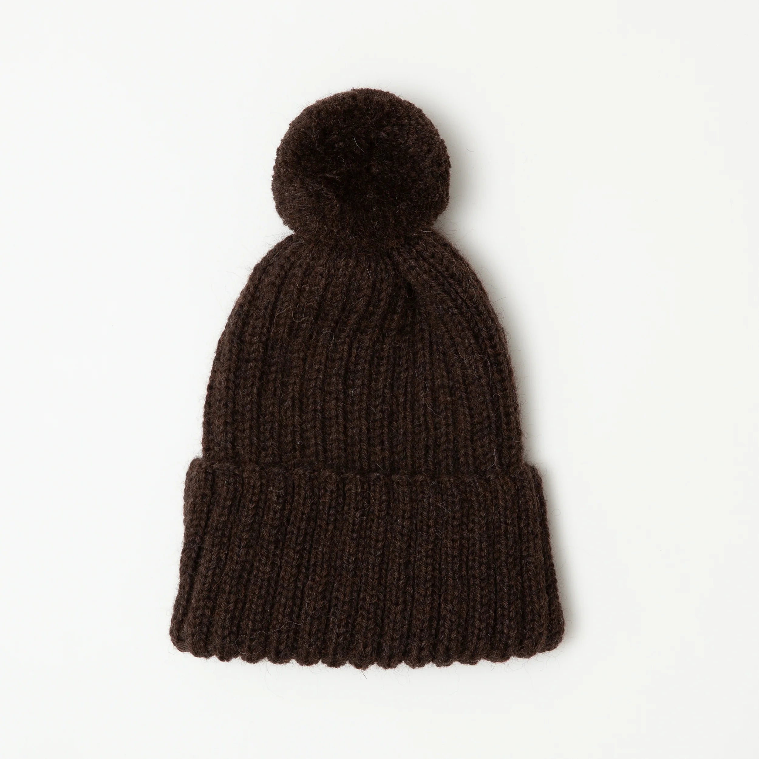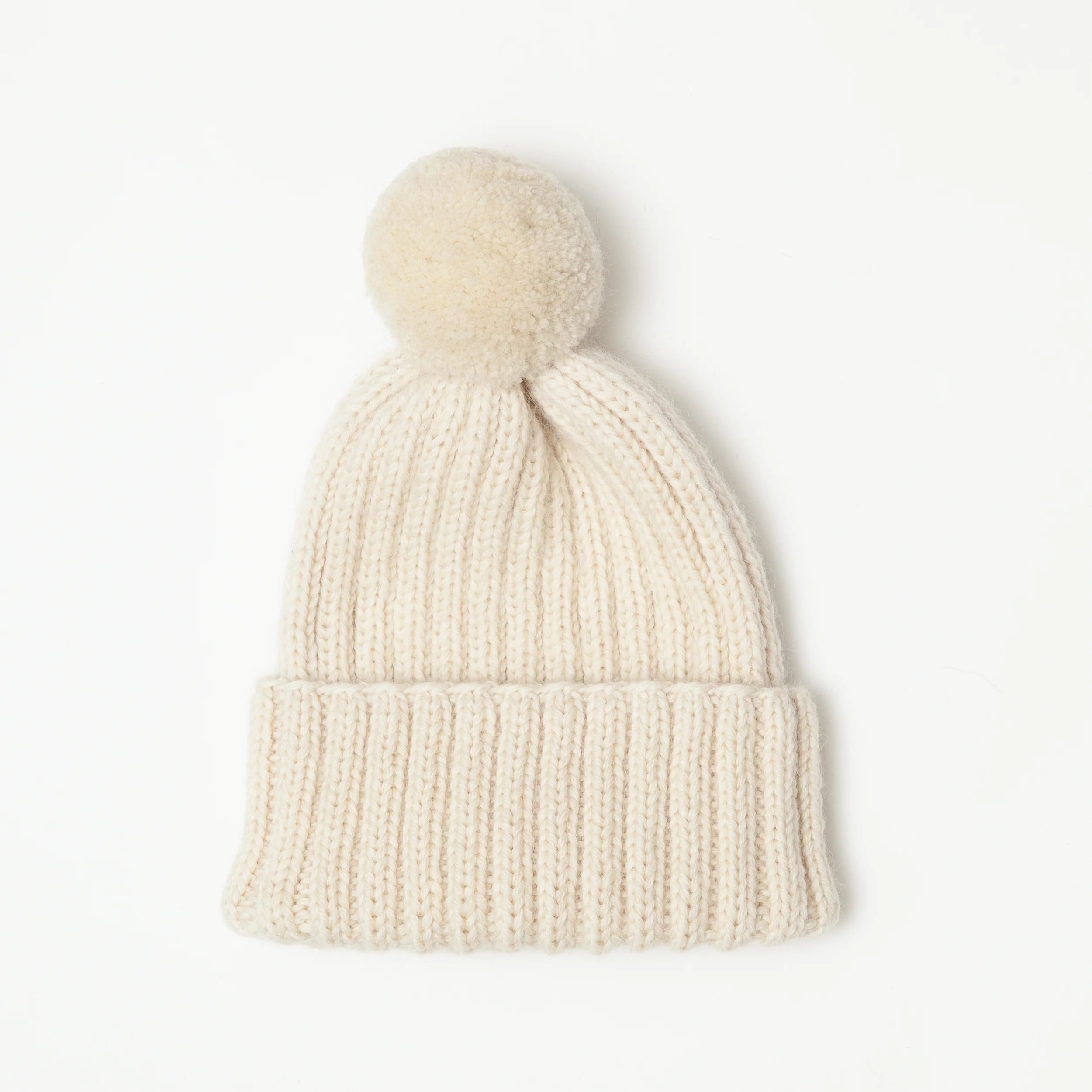 The unisex hat is made from 55% Alpaca 45% Merino wool. It's produced using zero waste methods and hand knitted with extra fine yarn in a way that is luxuriously soft and thick. The pompom is made from the same yarn as the beanie and is non-removable.