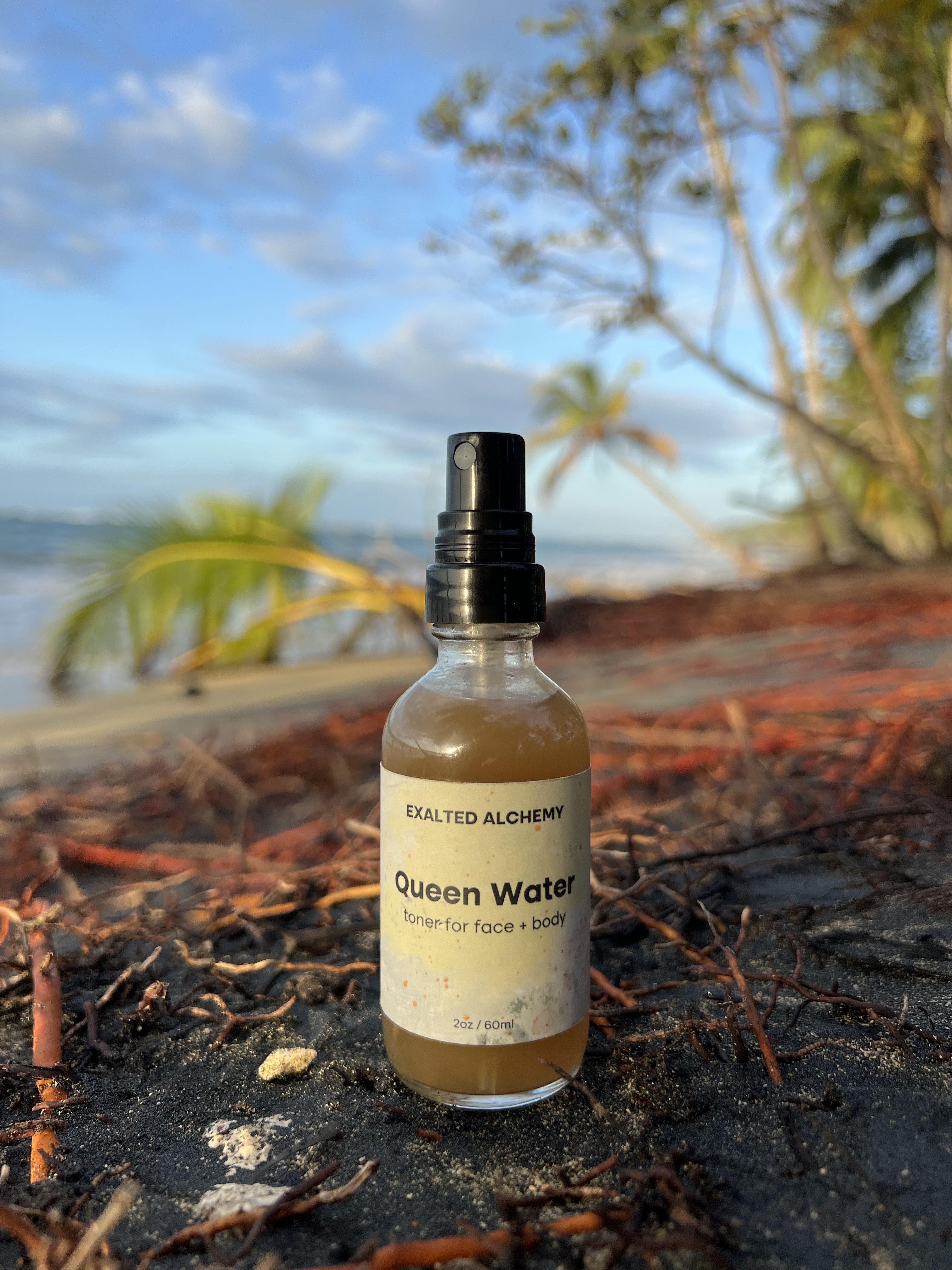 Queen water is our version of an ancient recipe called Queen of Hungary’s water - this recipe was used by queens and royalty throughout the times, when herbs and vinegar were some of the most prized beauty treatments. This is an incredible multi use product that can be used as a facial toner, hair toner, and scalp healer. ACV was infused with some of the most healing herbs for the skin, combined with rose water to keep the vinegar from being too intense