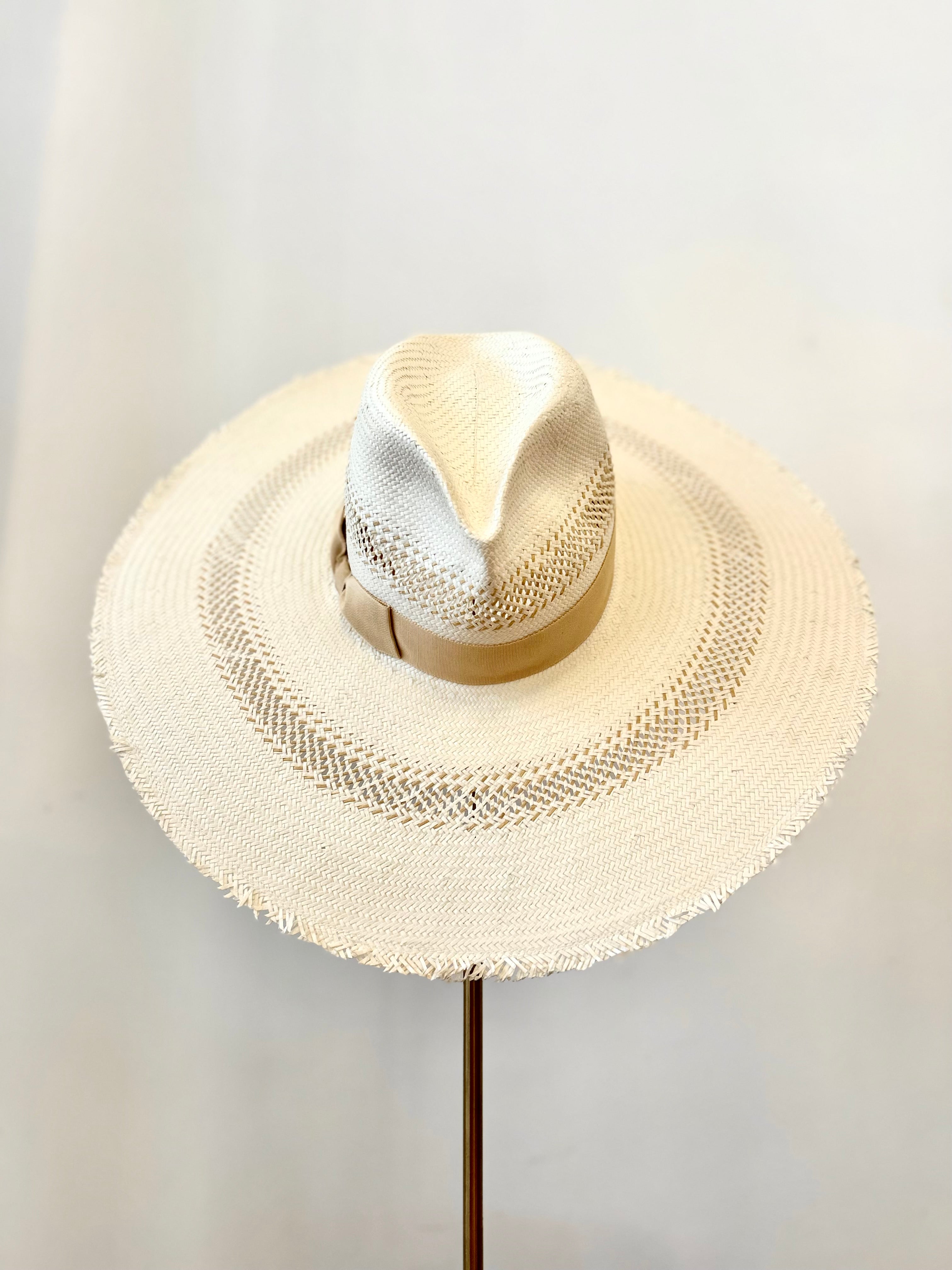 Cream & Tan Wide Brim Hat w/ Frayed Edge