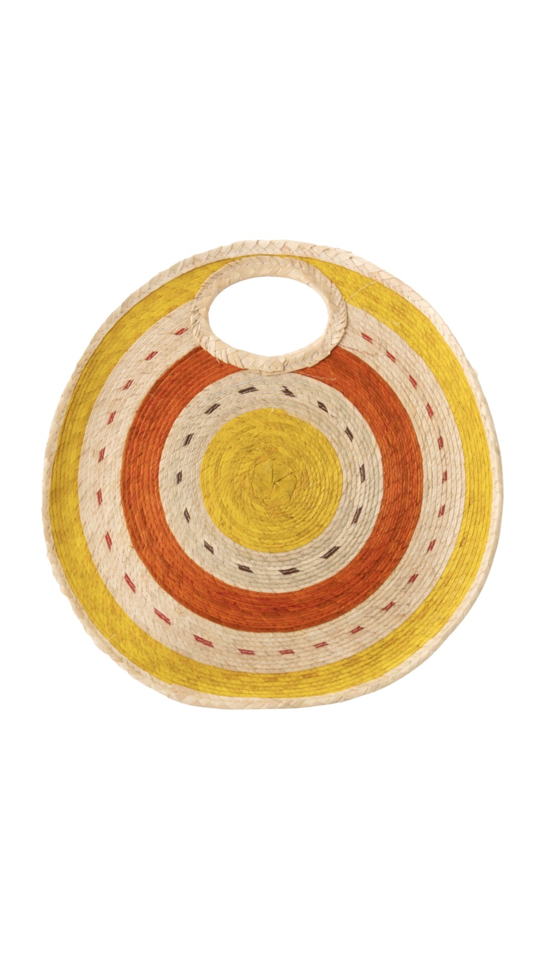 This simple round handheld straw tote makes a statement in playful vibrant color combos. Slip the Round Straw Tote on your arm and get outside as you start your staycation.
