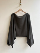 This unique baltic style cape shirt by Vilma Mare features her signature cross sewn details on the front panel. Carefully constructed with a thin mixed fiber and wool fabric, combining ultra sleek design with classic warmth. Wear this flowing cape over long sleeve layers and jeans or a additional layer with a dress and boots.