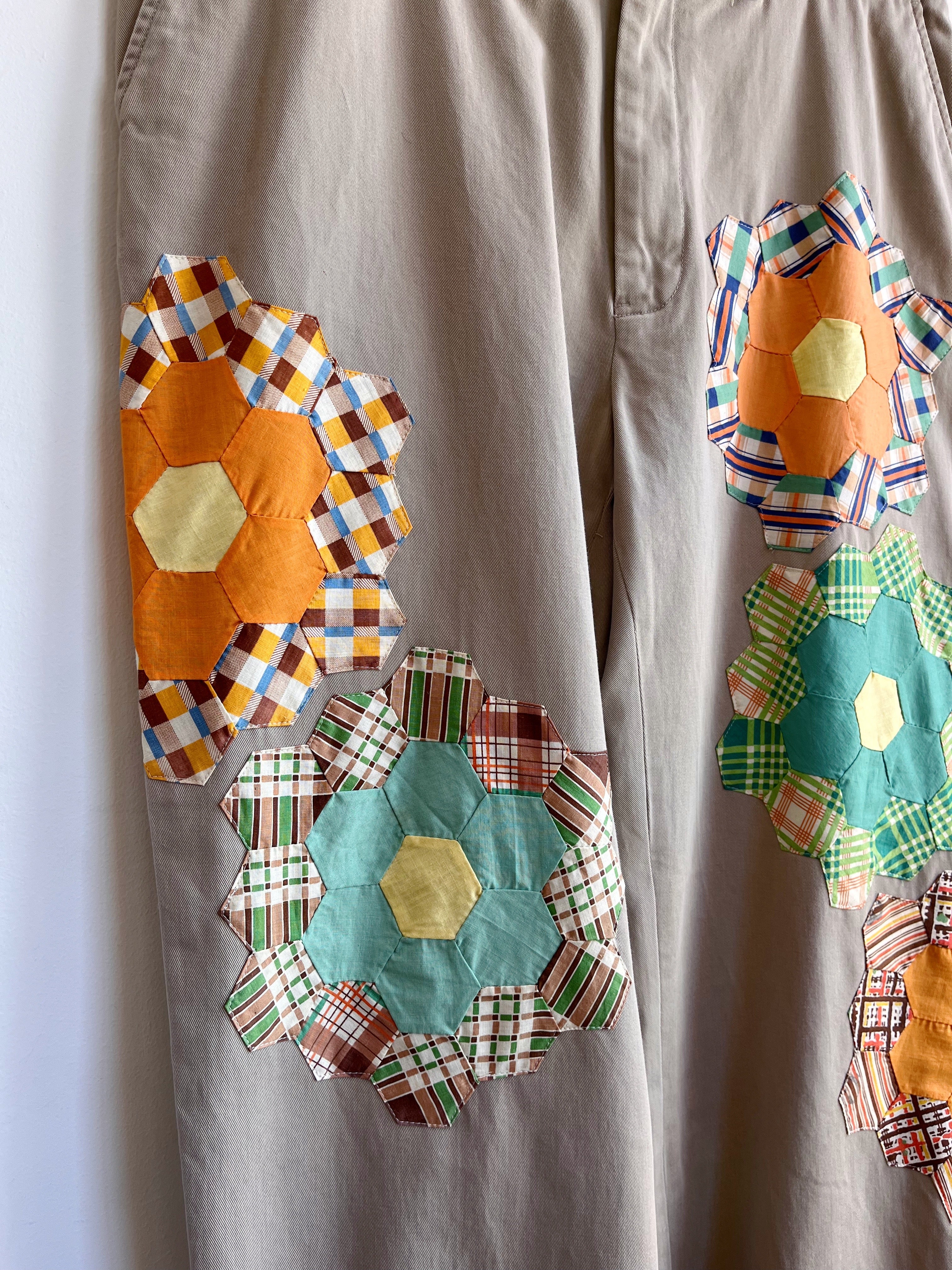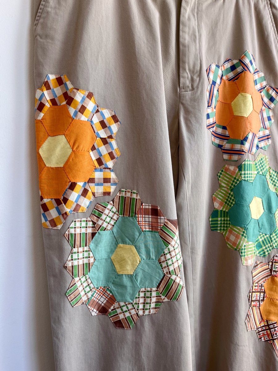 Vintage khakis take on a whole new life thanks to Chris Easter’s artful appliqué of vintage Dresden plate quilt blocks. Each pair is one of a kind.