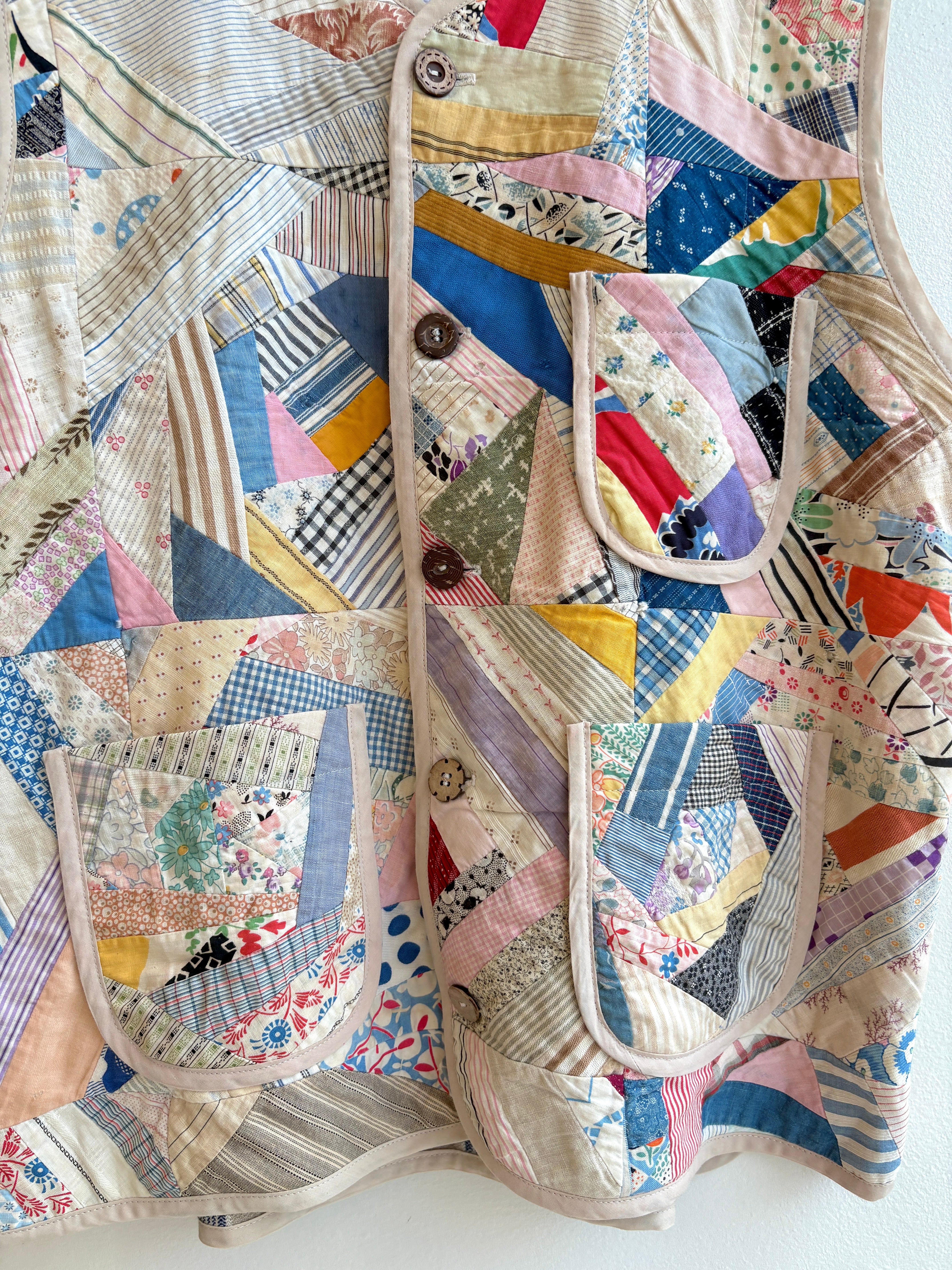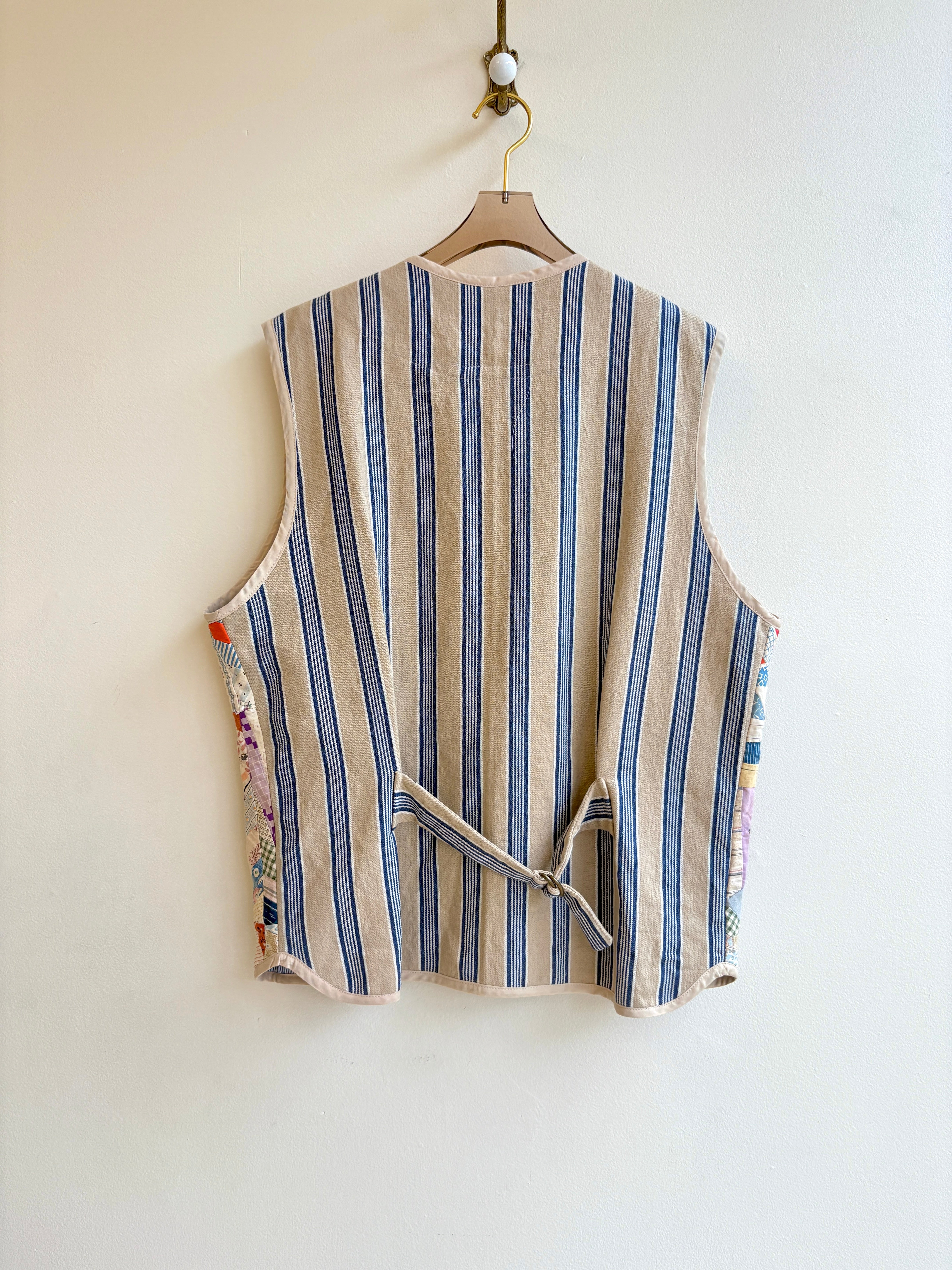 This colorful one-of-a-kind vest was sewn from a vintage crazy quilt (for the front) and a vintage striped textile (for the back), with a button-up front and three patch pockets. It will be a conversation starter wherever you go.