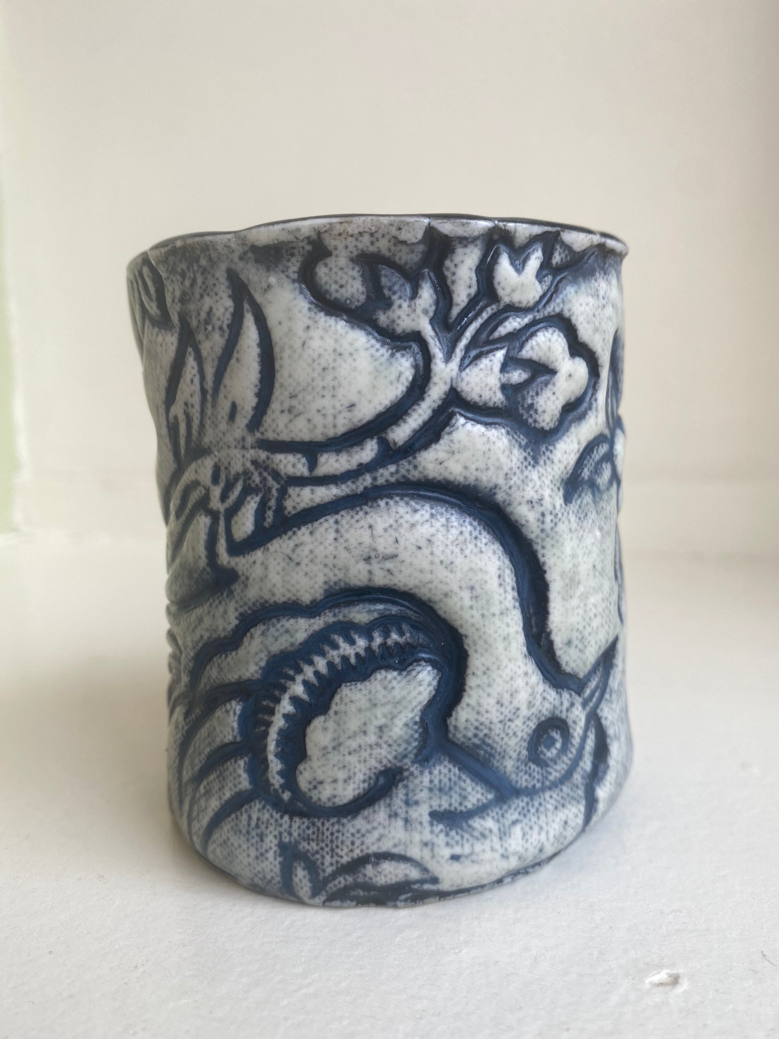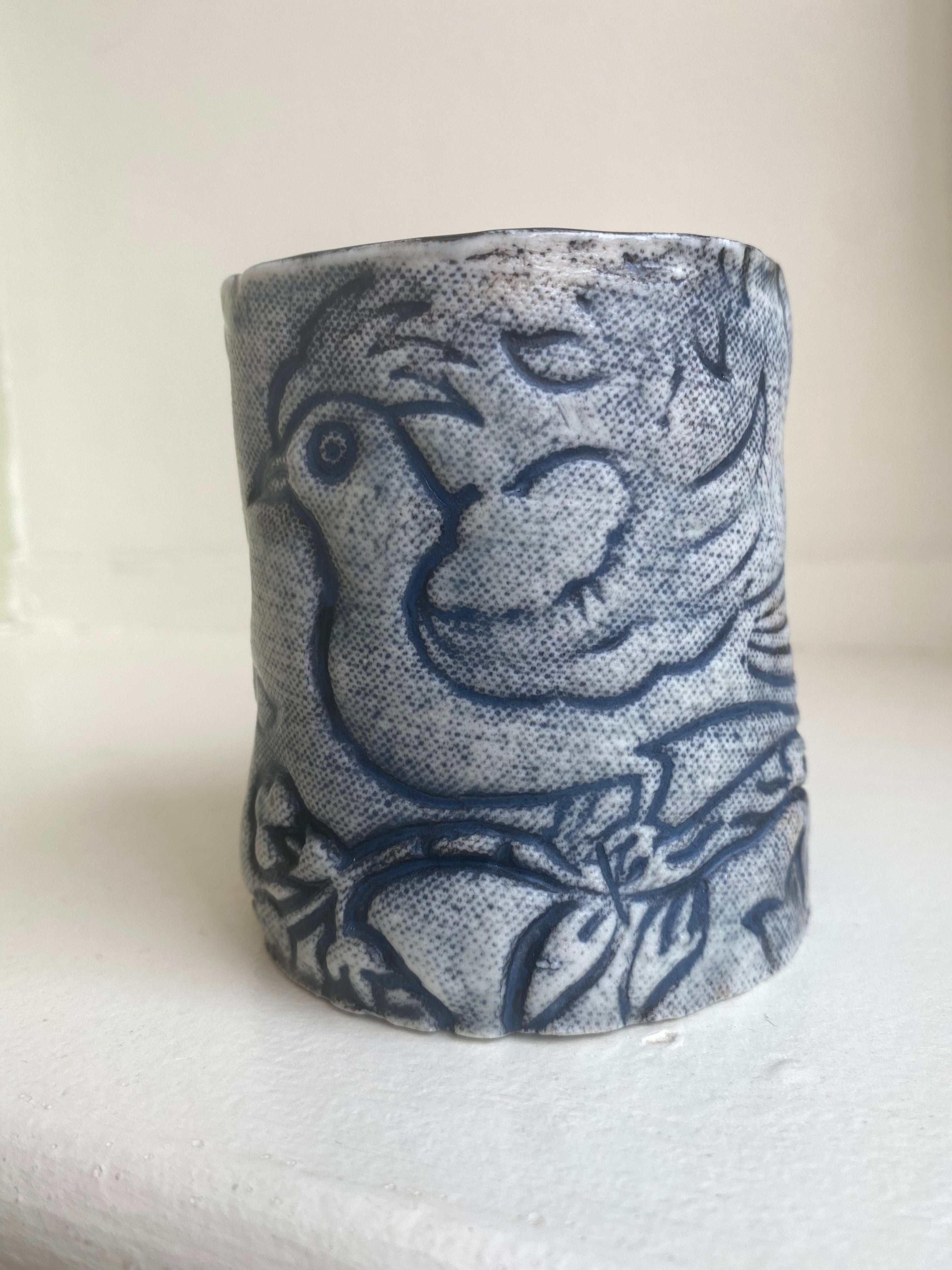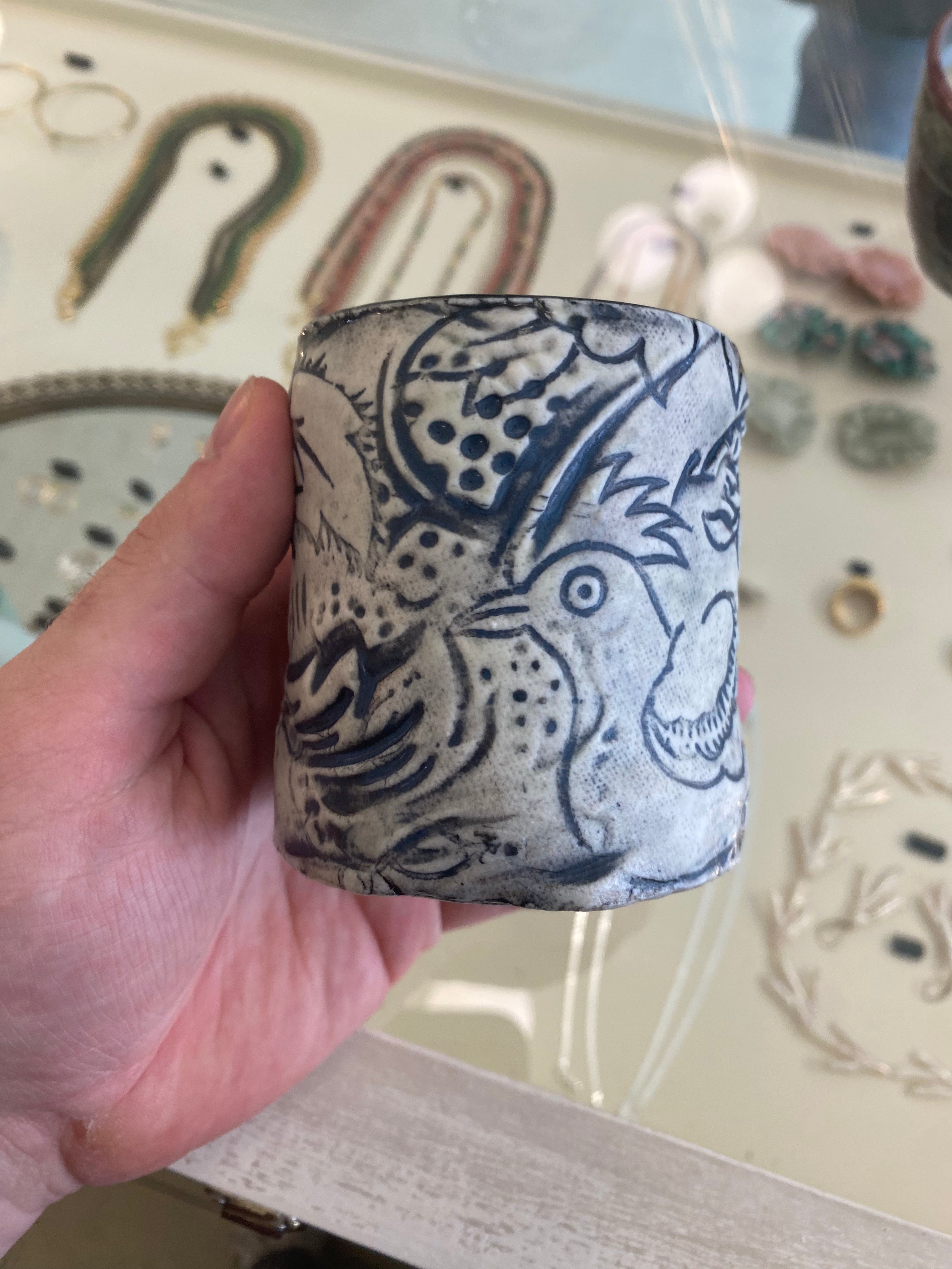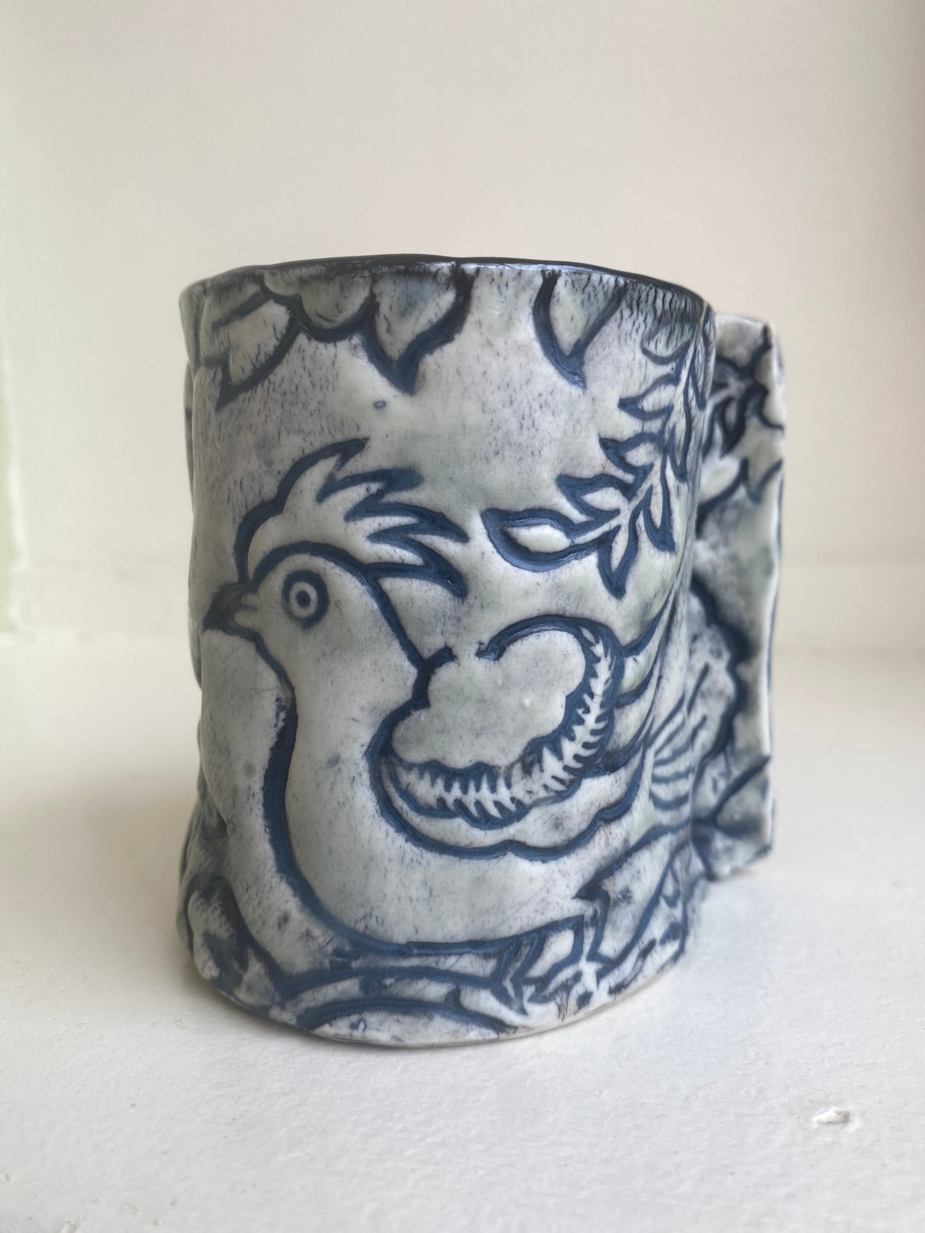 Add a touch of whimsy to your morning coffee with these expertly crafted with unique one of a kind designs hand-carved Bird Blue Mugs by Laura Ann Jacobs Ceramics. Made in Hudson, New York, this women-owned business brings charm and personality to your daily routine.