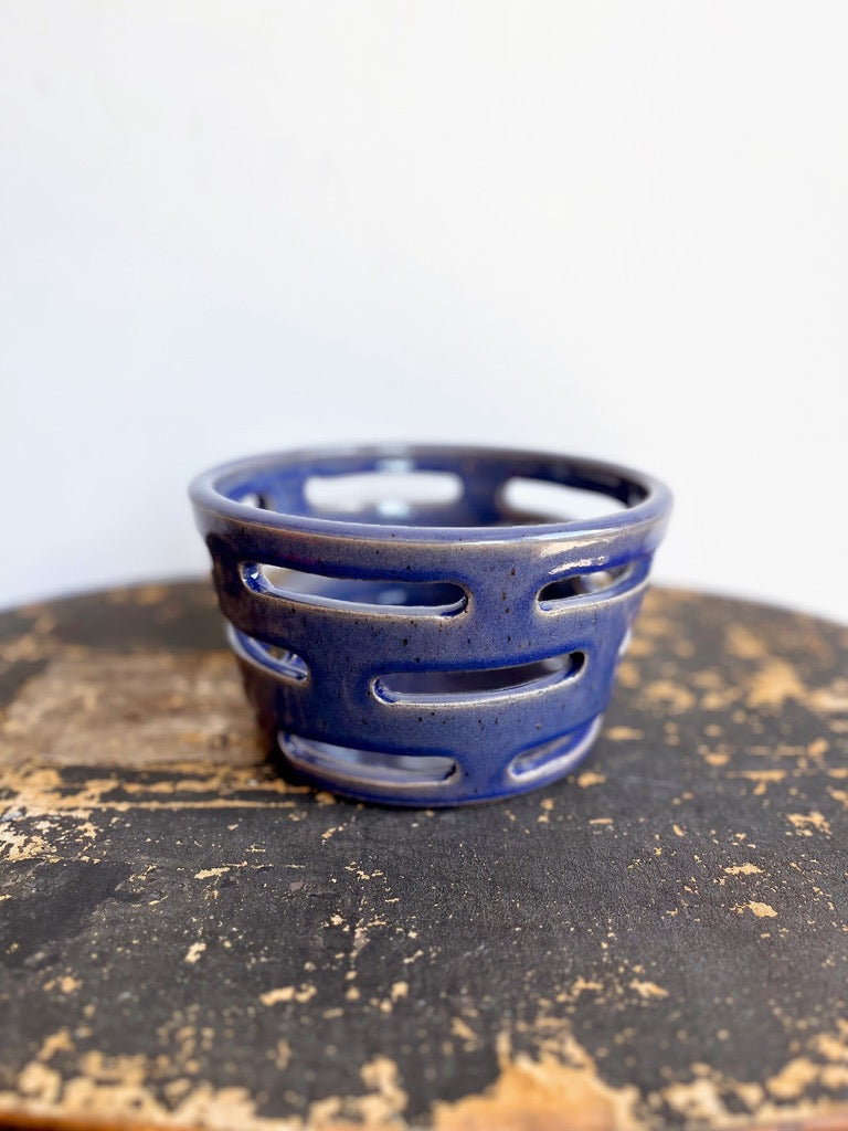 This artisan stoneware basket is the perfect blend of modern kitchen decor and rustic farmhouse style. Sleek oval cutouts make this ceramic berry bowl a functional classic. It’s a beautiful way to display seasonal produce while keeping your countertops clean and stylish. This bowls are glazed in a deep cobalt blue.