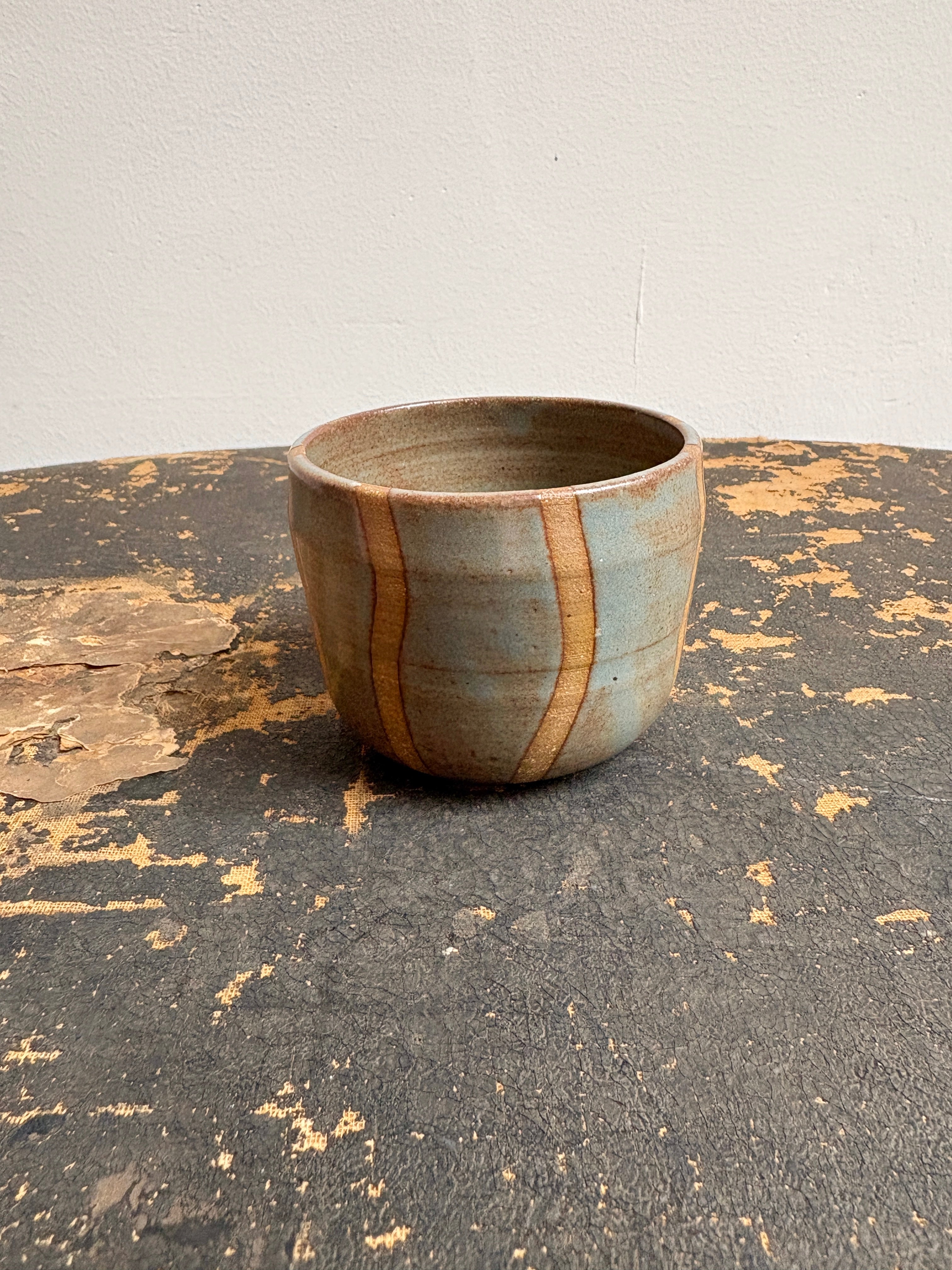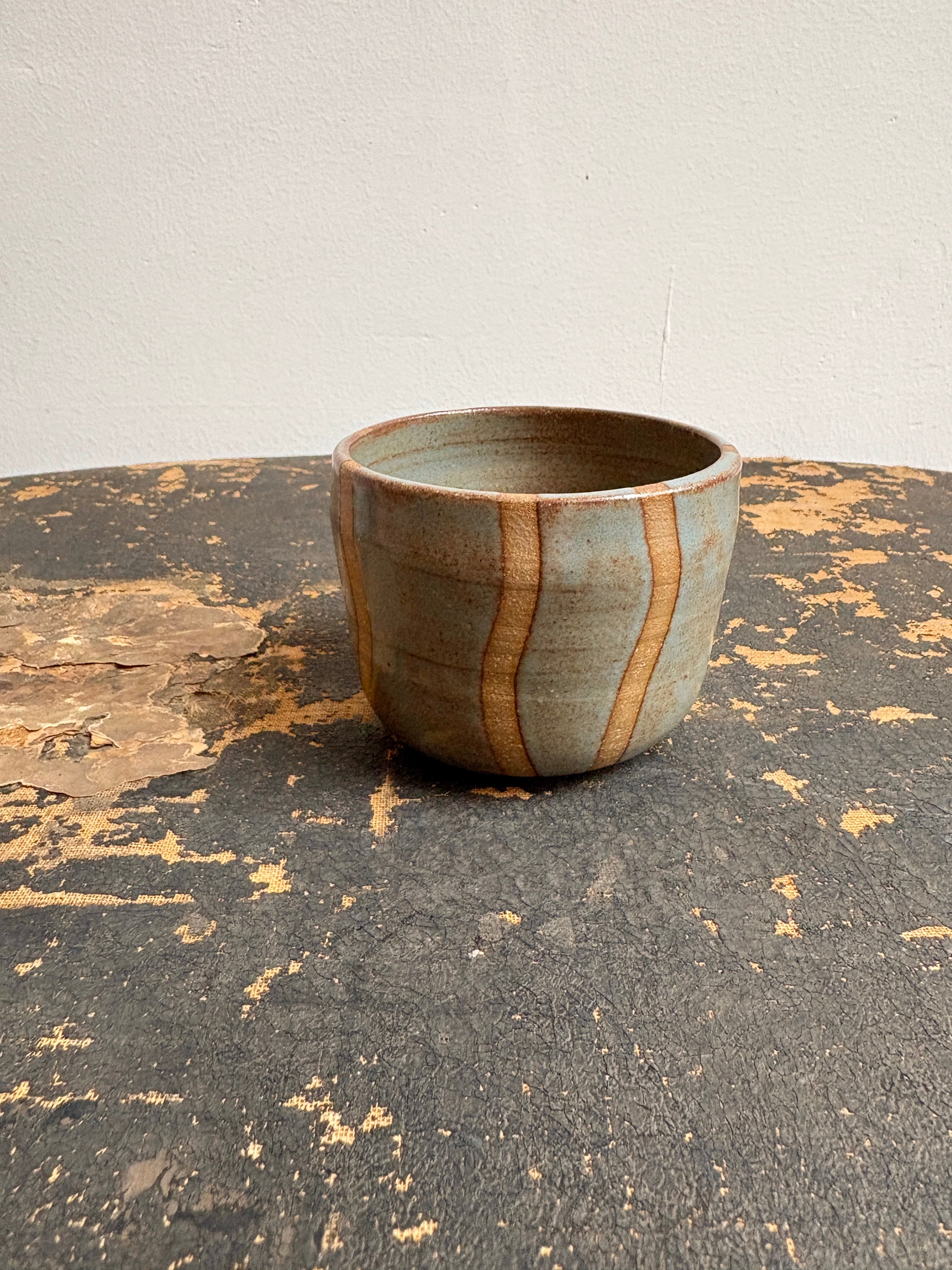 This small tea cup from Kendall Ross Ceramics is a crafted from stoneware clay, use it for your morning espresso or by the nightstand as a jewelry catch. Blue-grey transparent glaze is accented by rust-colored vertical undulating lines.