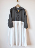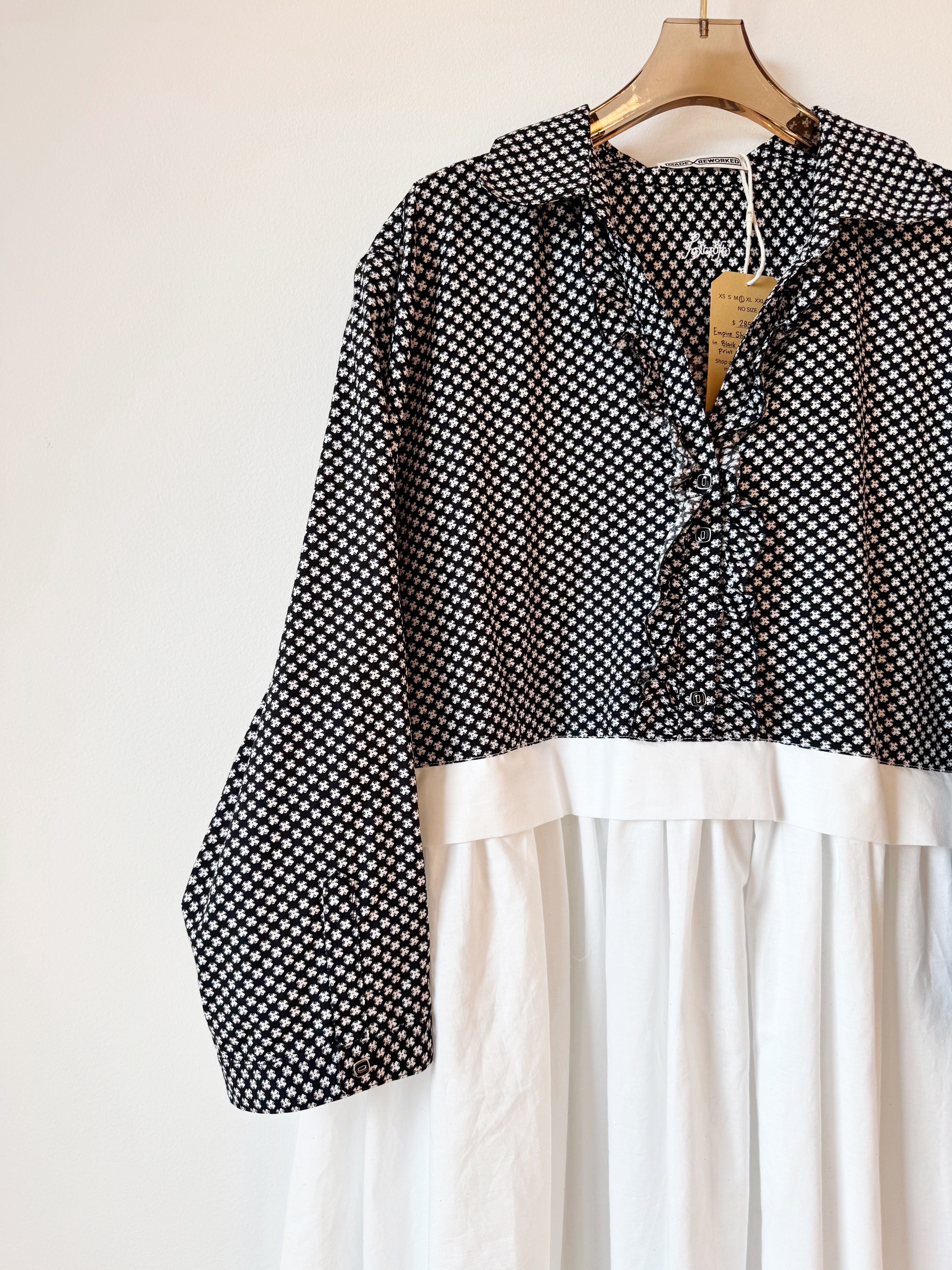 For the newest dress style for our Made X Reworked line, we’re sourcing men’s shirts from a local social-justice thrift store, Thrift2Fight, and breathing new life into them. Each design is slightly different and of course starts with a different shirt. This one combines a black and white flower print shirt with ruffled placket shirt with white cotton shirting for a full-skirted shirtwaist shirtdress with an empire waistline.