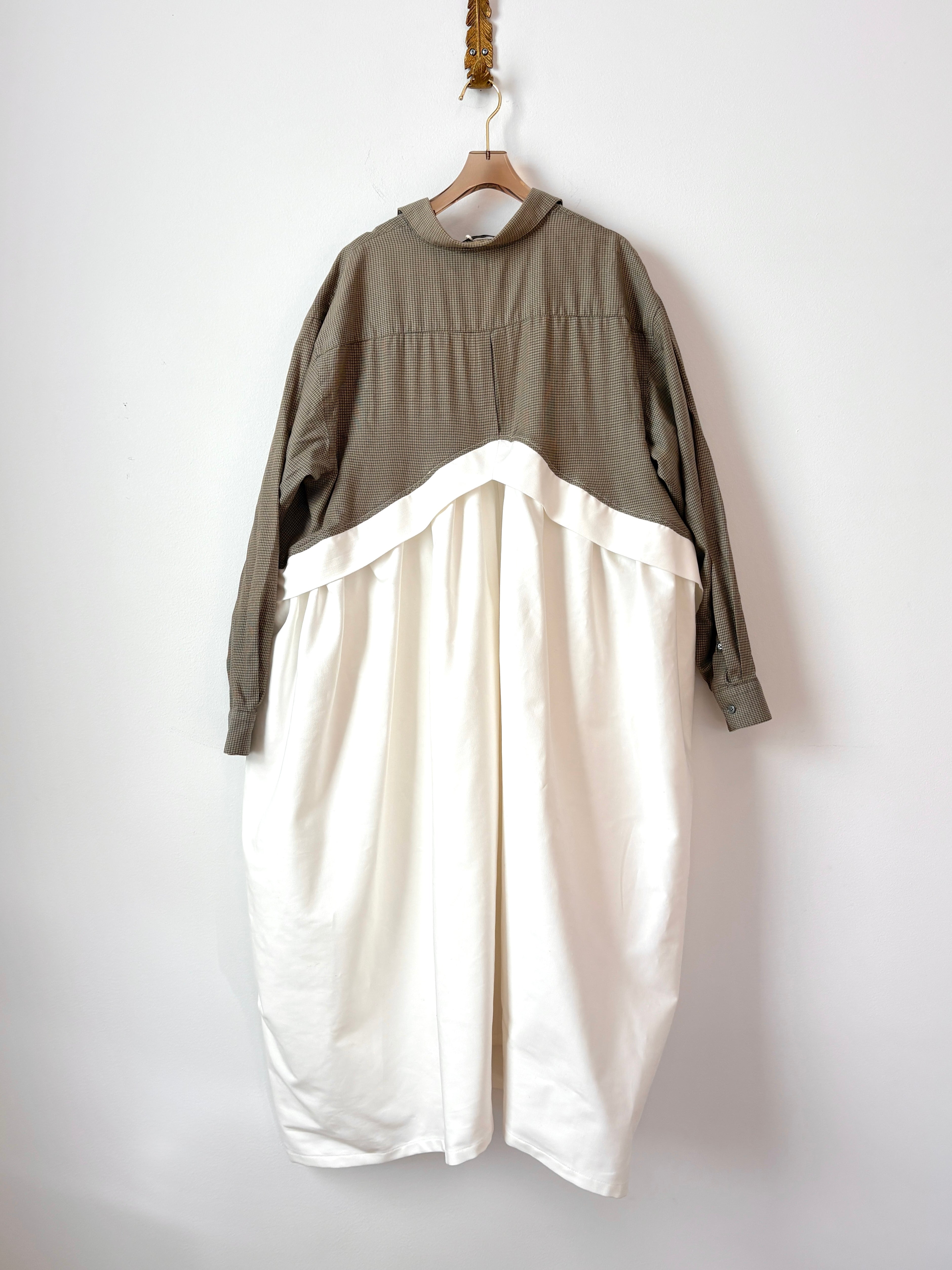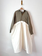 For the newest dress style for our Made X Reworked line, we’re sourcing men’s shirts from a local social-justice thrift store, Thrift2Fight, and breathing new life into them. Each design is slightly different and of course starts with a different shirt. This one combines a men’s button-down olive tone micro plaid shirt with white cotton shirting for a full-skirted shirtdress with a soft inverted V waistline.