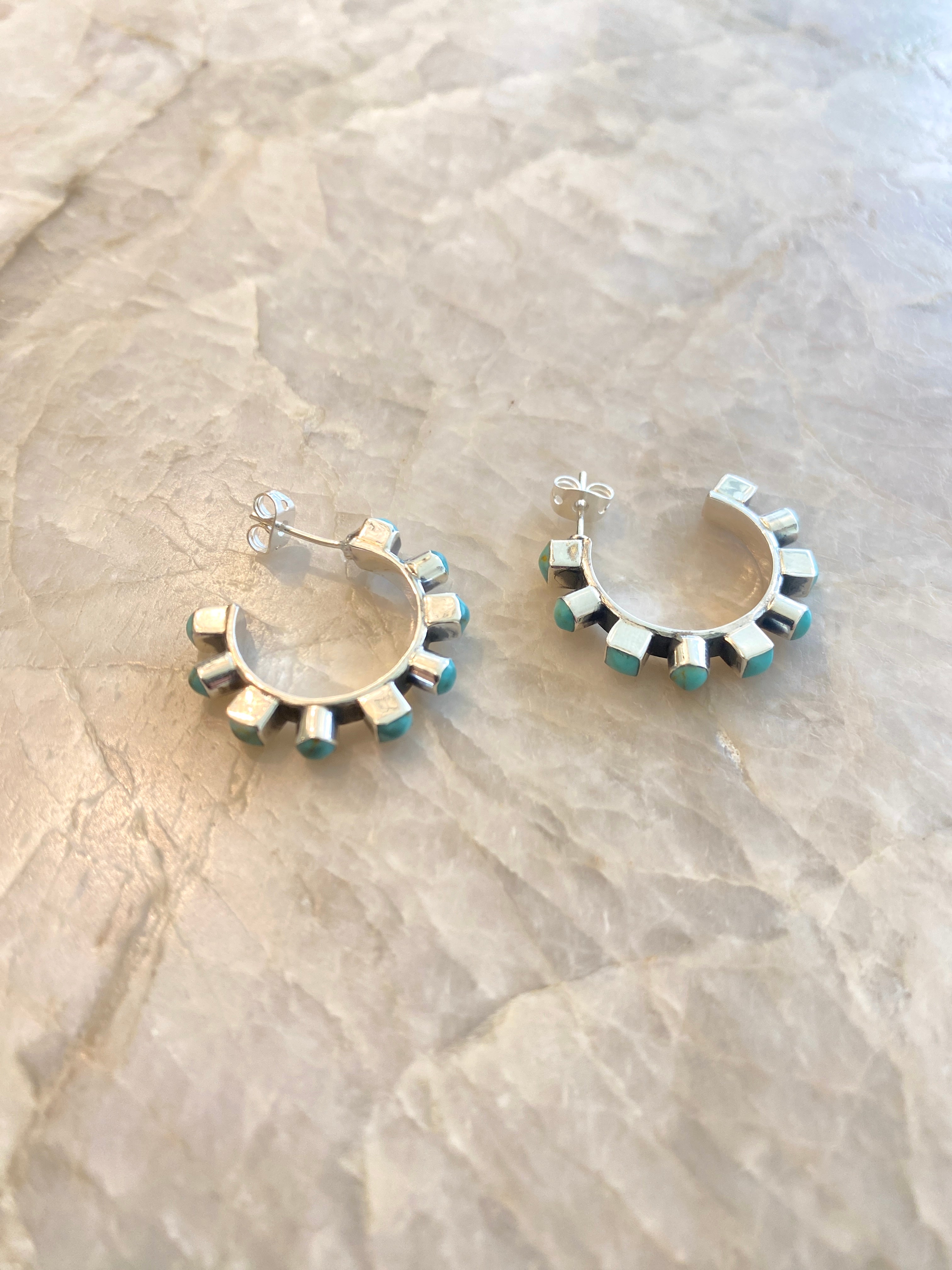 - solid sterling silver hoops with bezel set round and square natural turquoise cabochons