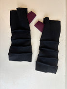 These fingerless wool mittens are made by Vilma Mare. In her signature black wool and burgundy fabric, these long gloves are a great addition to one of her classic jackets.