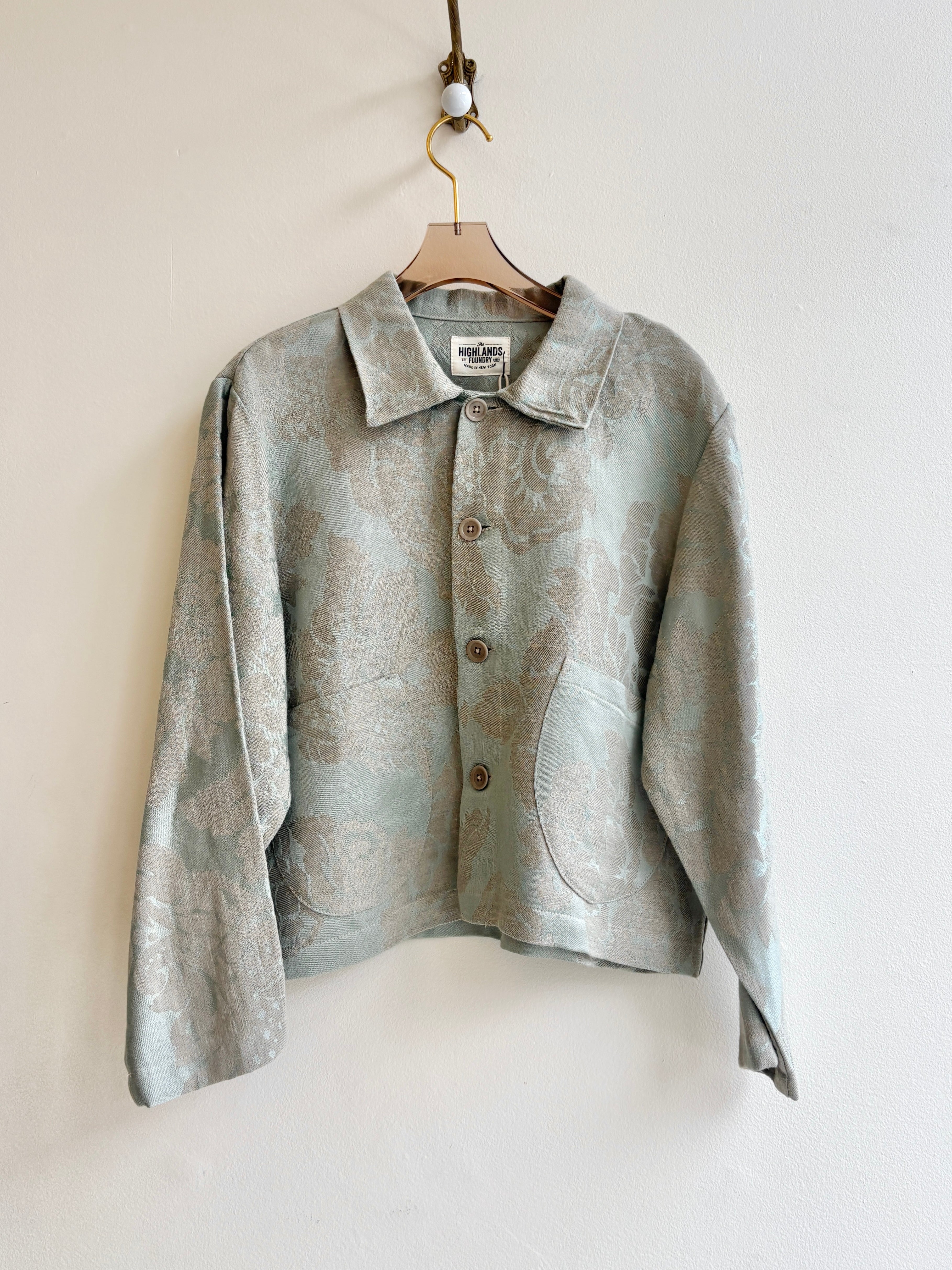 Step into timeless style with this one-of-a-kind utility jacket by Highland Foundry, crafted from vintage sage green floral damask cloth. Featuring a button front, classic collar, and long sleeves, this piece combines retro charm with everyday functionality. Perfect for layering and built to last, this jacket brings history to your wardrobe. Don’t miss your chance to own a piece of the past!