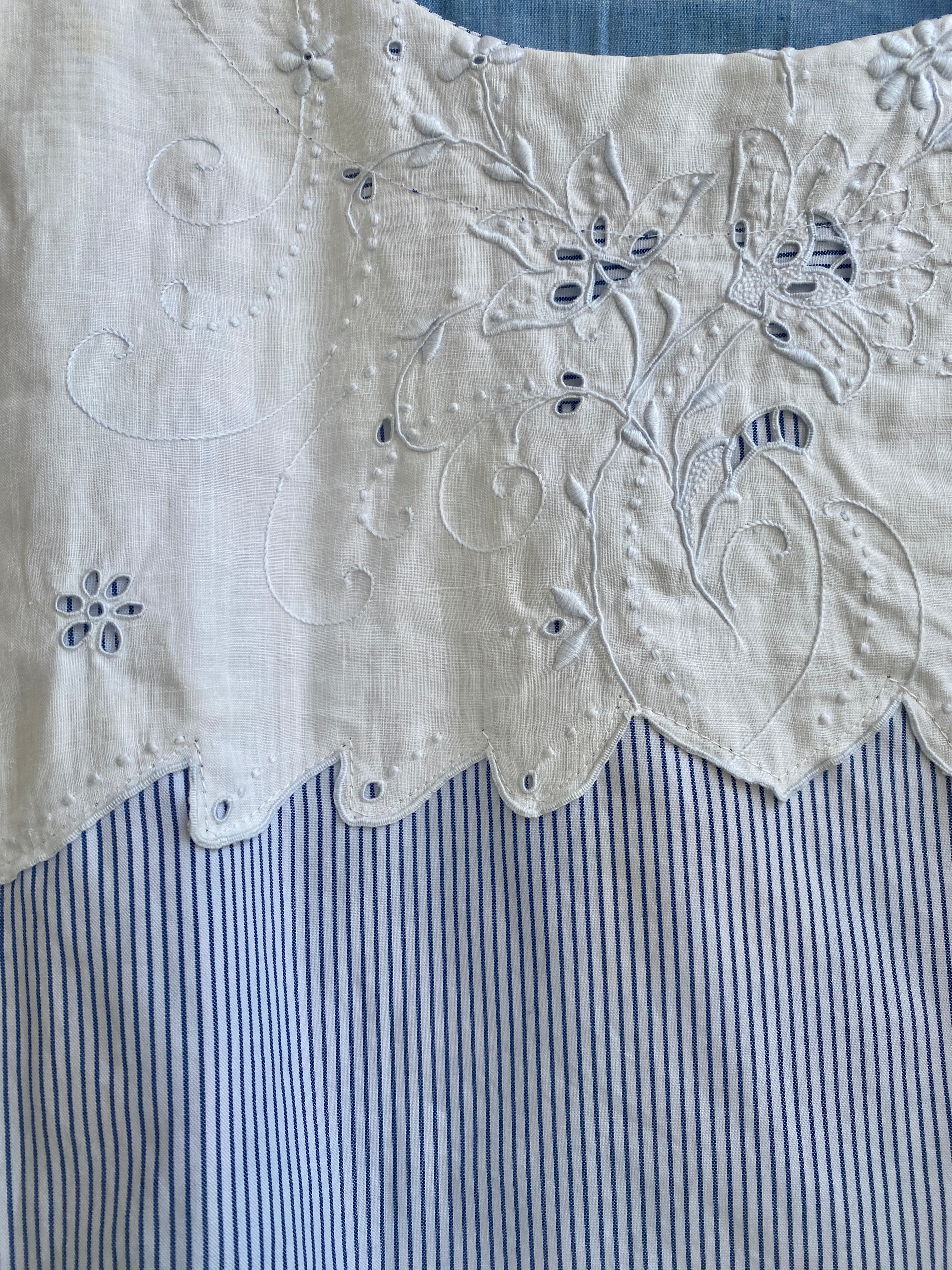 Blue & White Pinstripe Box Top w/ White Embroidered Appliqué