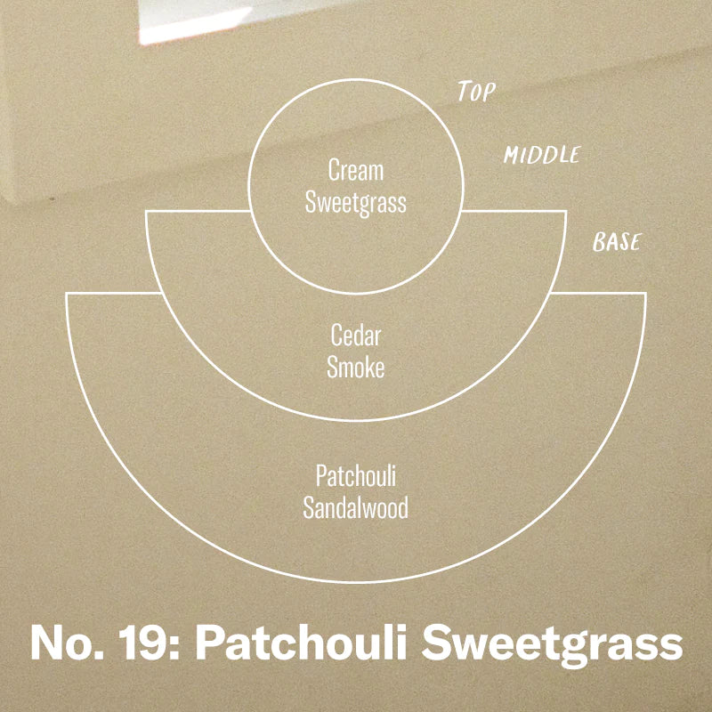 - No. 19 Patchouli Sweetgrass - A windows-open, incense-burning Saturday with nowhere to be. Cream, sweetgrass, and smoke.