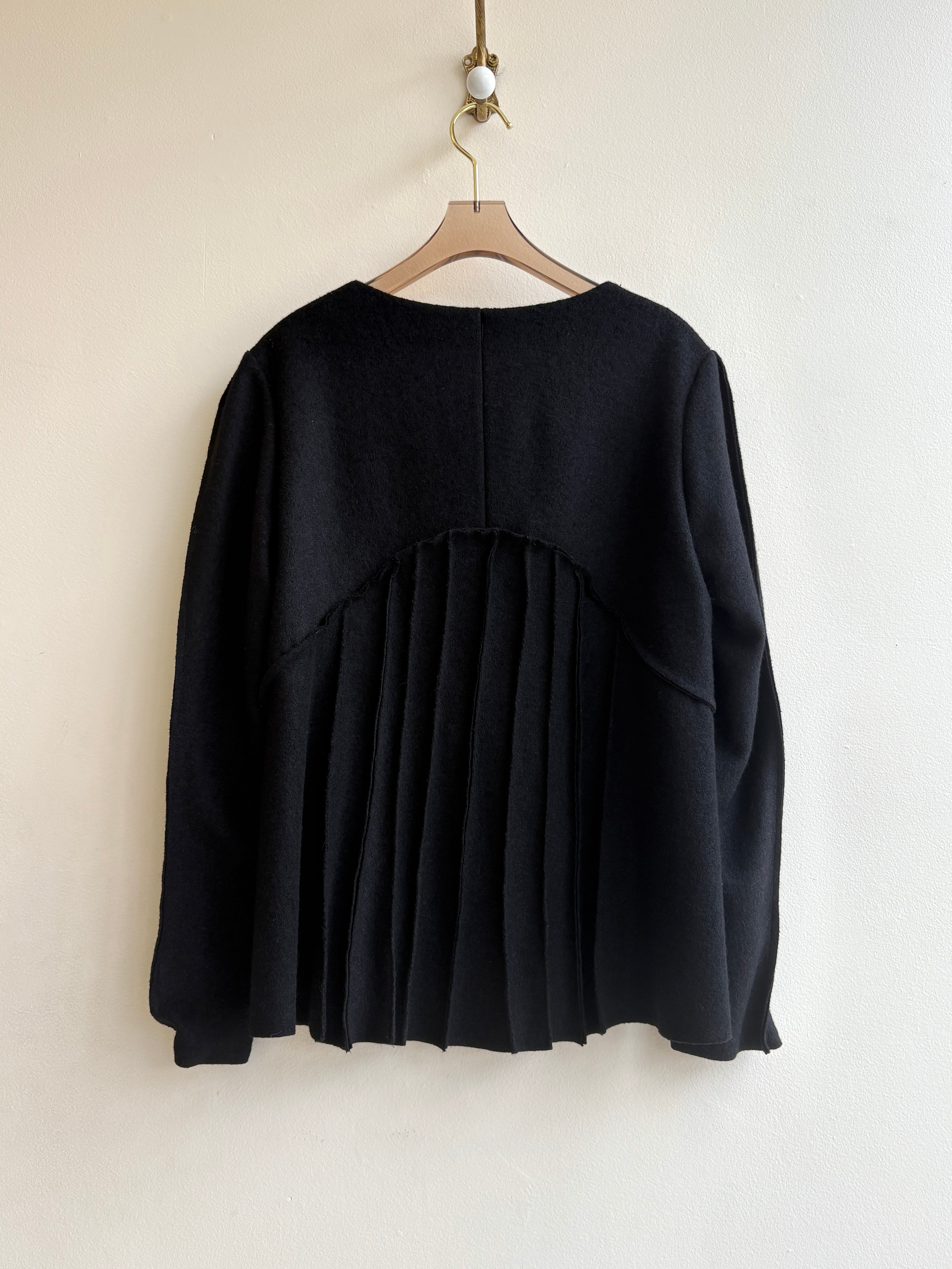 - Black wool with decorative baltic seaming over front and back of jacket.