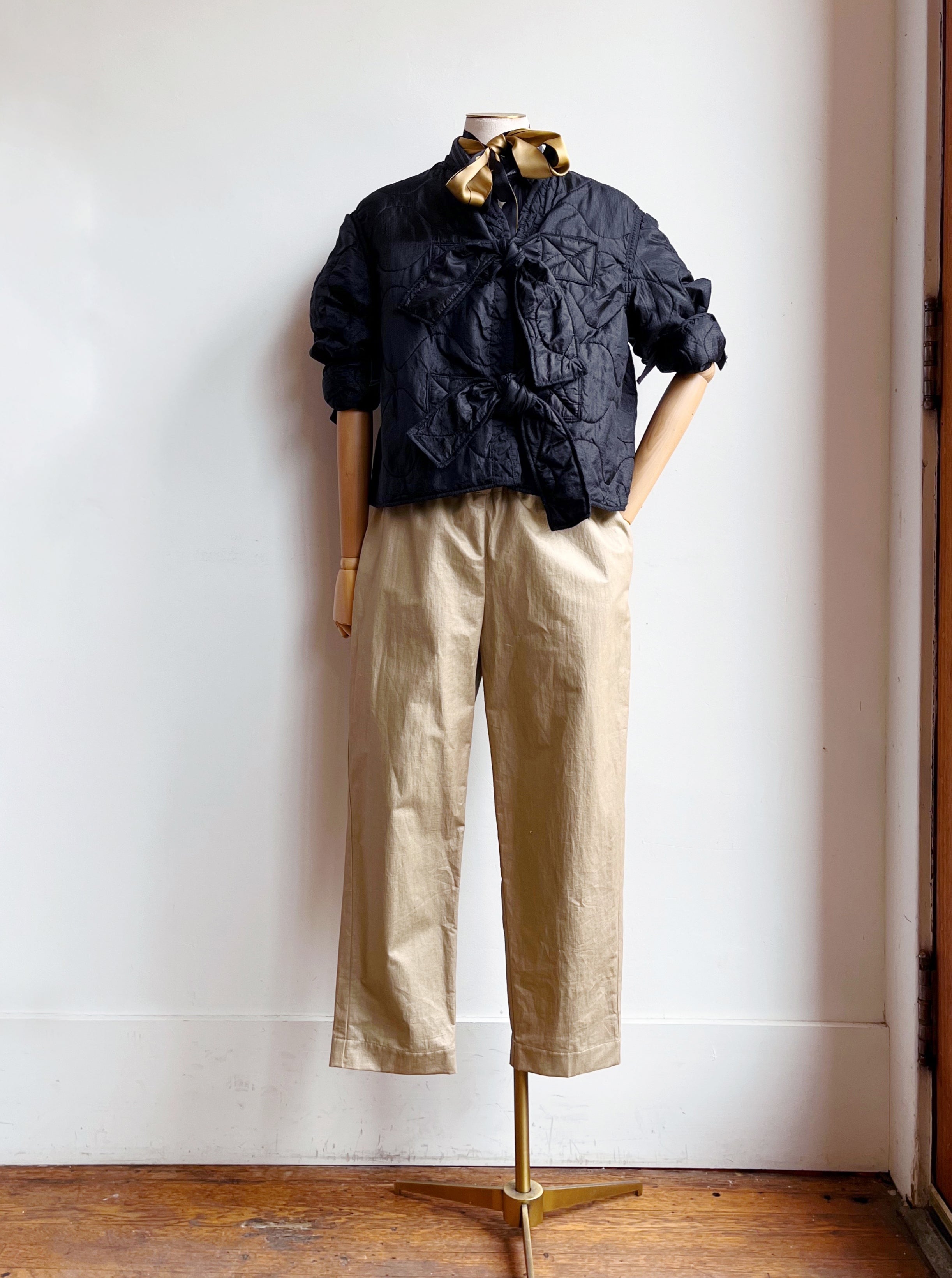 This reworked vintage M-65 Military Liner Jackets, upcycled by Sloppy Seconds, is the perfect blend of utility and style. Versatile in every way; from transitioning between seasons, layering underneath other jackets, or as a statement in itself. This coat is in black with double tie closure made from scrap liner ties.