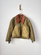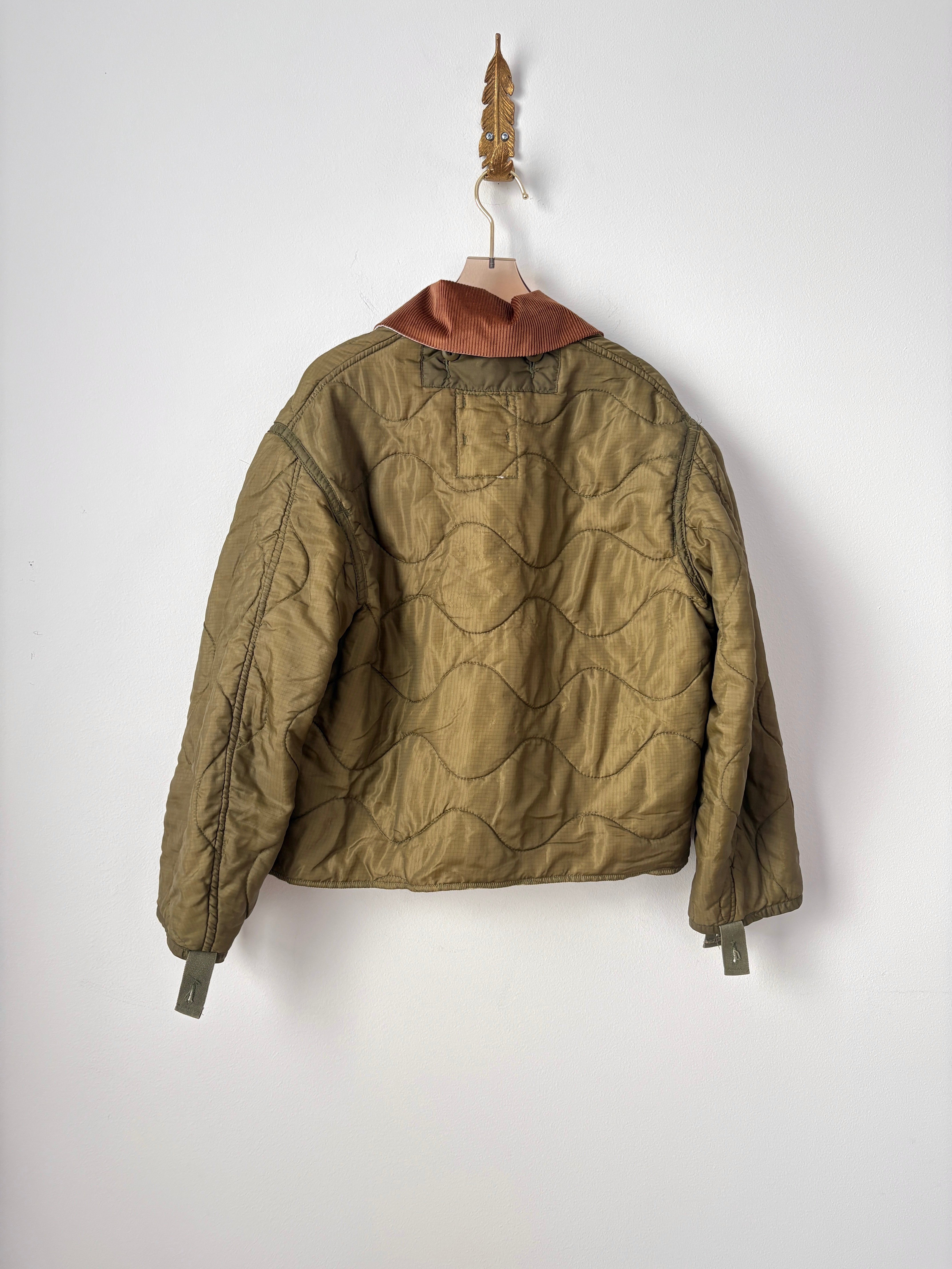 Dark Olive Green Army Liner Quilted Coat w/ Brown Corduroy Collar, Brown Buttons, & Light Olive Pockets (Reworked)