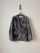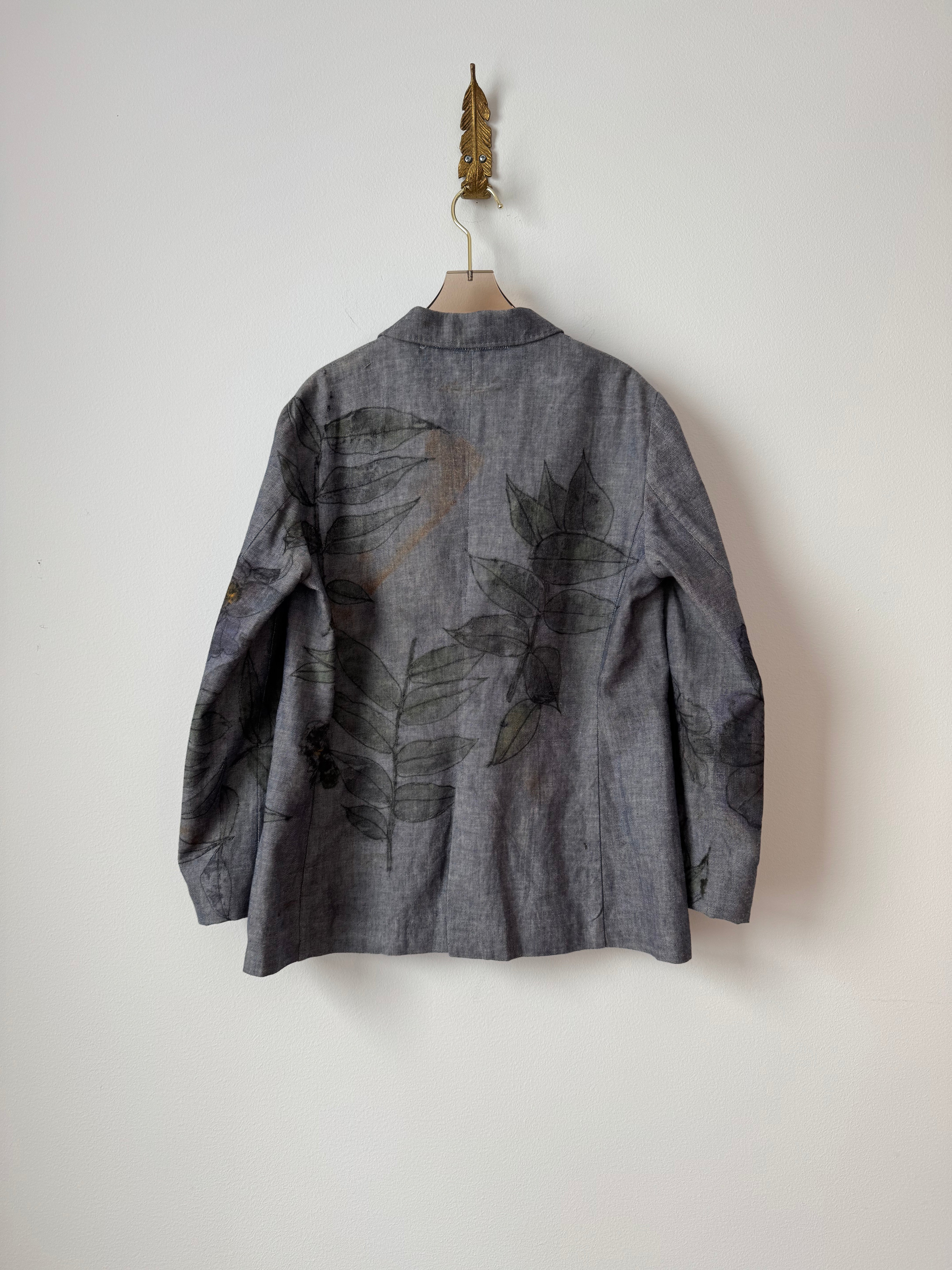 This eco-printed dusty blue blazer is a one-of-a-kind piece, upcycled by Sherri Cohen Design. This cotton linen blazer has pieced botanical printing over front and back. Embellished with fabric paint over eco printing using real leaves resulting in delicate, organic impressions that connect you to the earth.