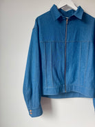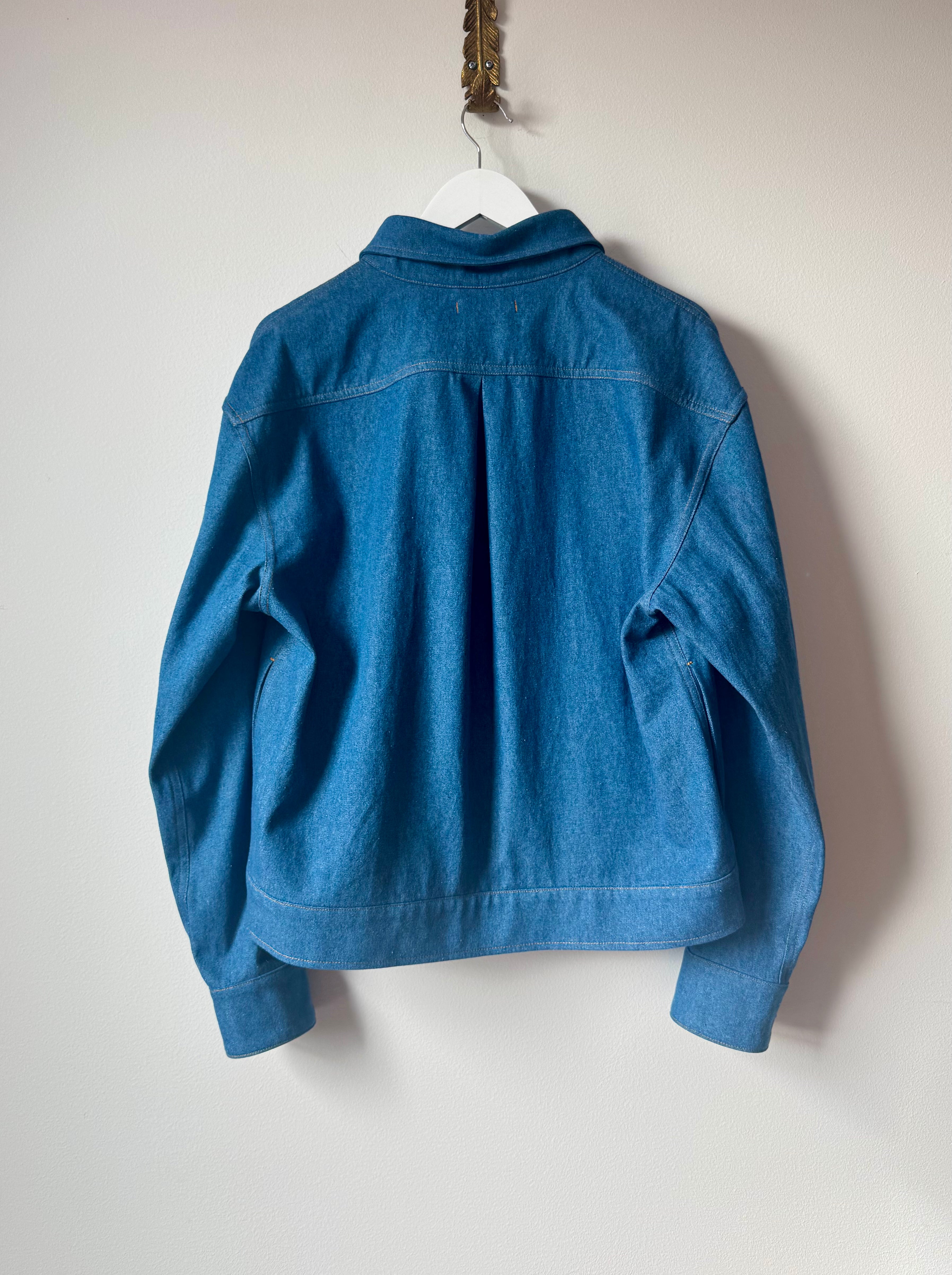 The Leisure Jacket is a sleek staple for all wardrobes, designed for everyday wear and long term durability. The clean silhouette, inset side seam pockets, and functional detailing make this piece a versatile garment that can move from city streets to evening events. This one-of-a-kind, unisex, zip up jacket is hand sewn in the MadeXHudson Atelier made from a deadstock medium blue denim fabric with gold stitching throughout.