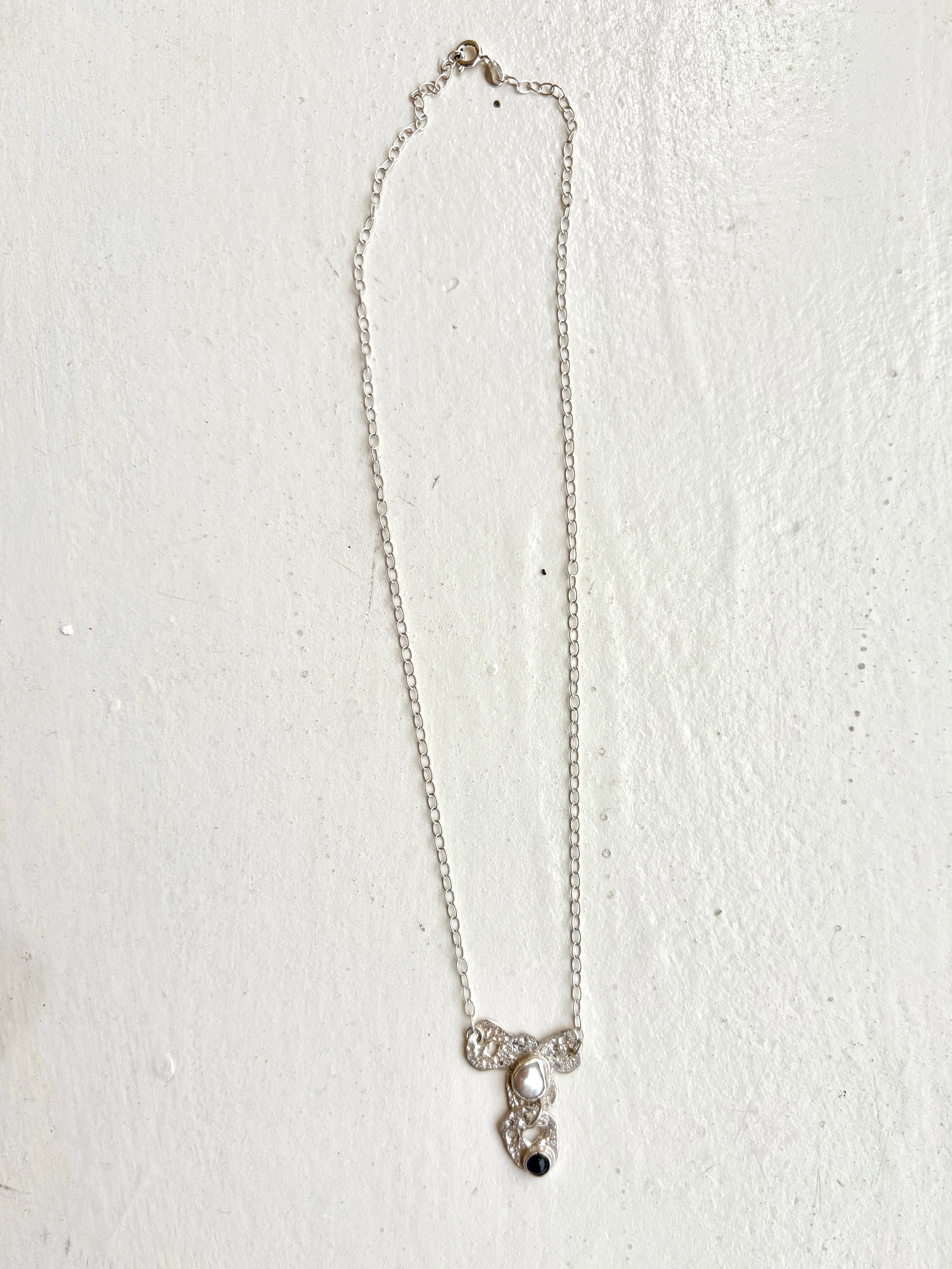 Black Onyx & Fresh Water Pearl Stone Set Sterling Silver Pendant Necklace
