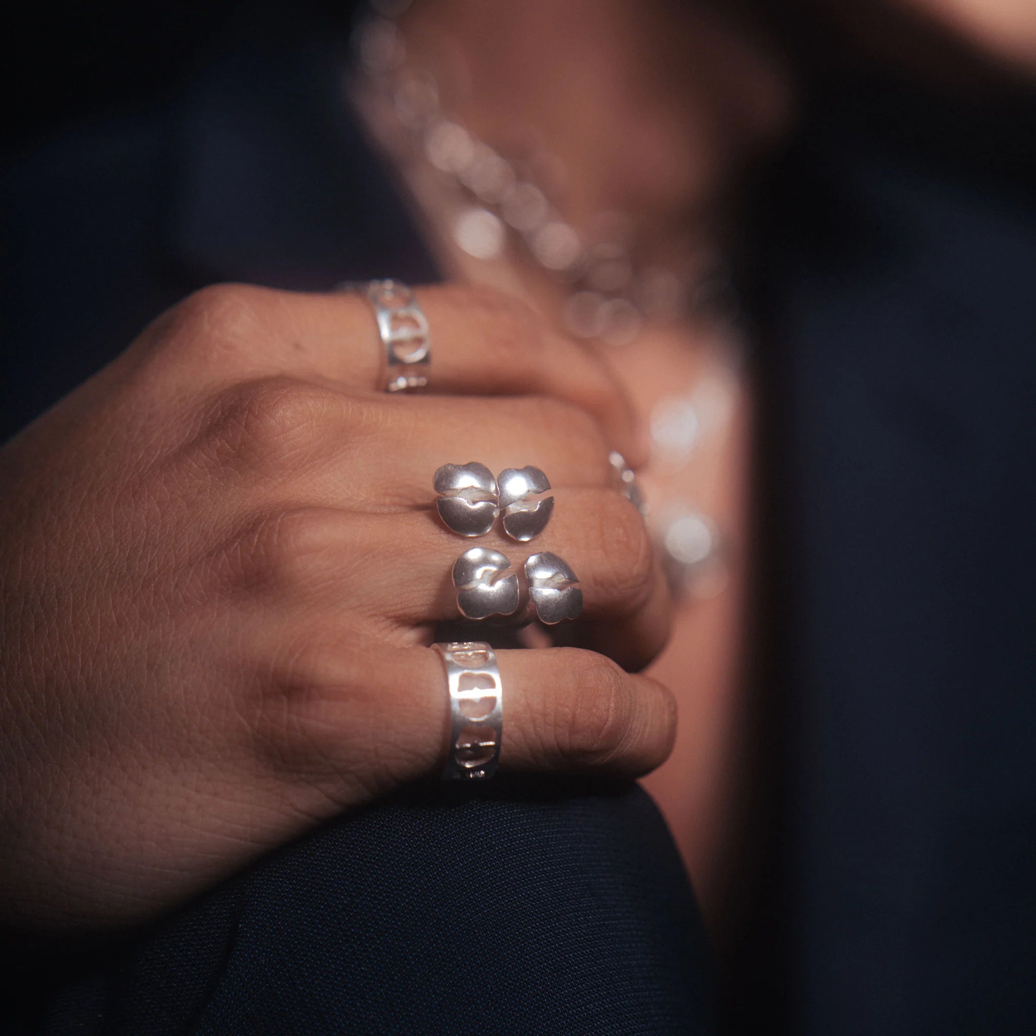 This Double Besos Ring embodies sustainability in its design. Its prototype utilizes 3D technology to minimize wax waste and is crafted from recycled metals, such as silver sourced from electronics, x-ray films, old jewelry, and various other reclaimed materials.