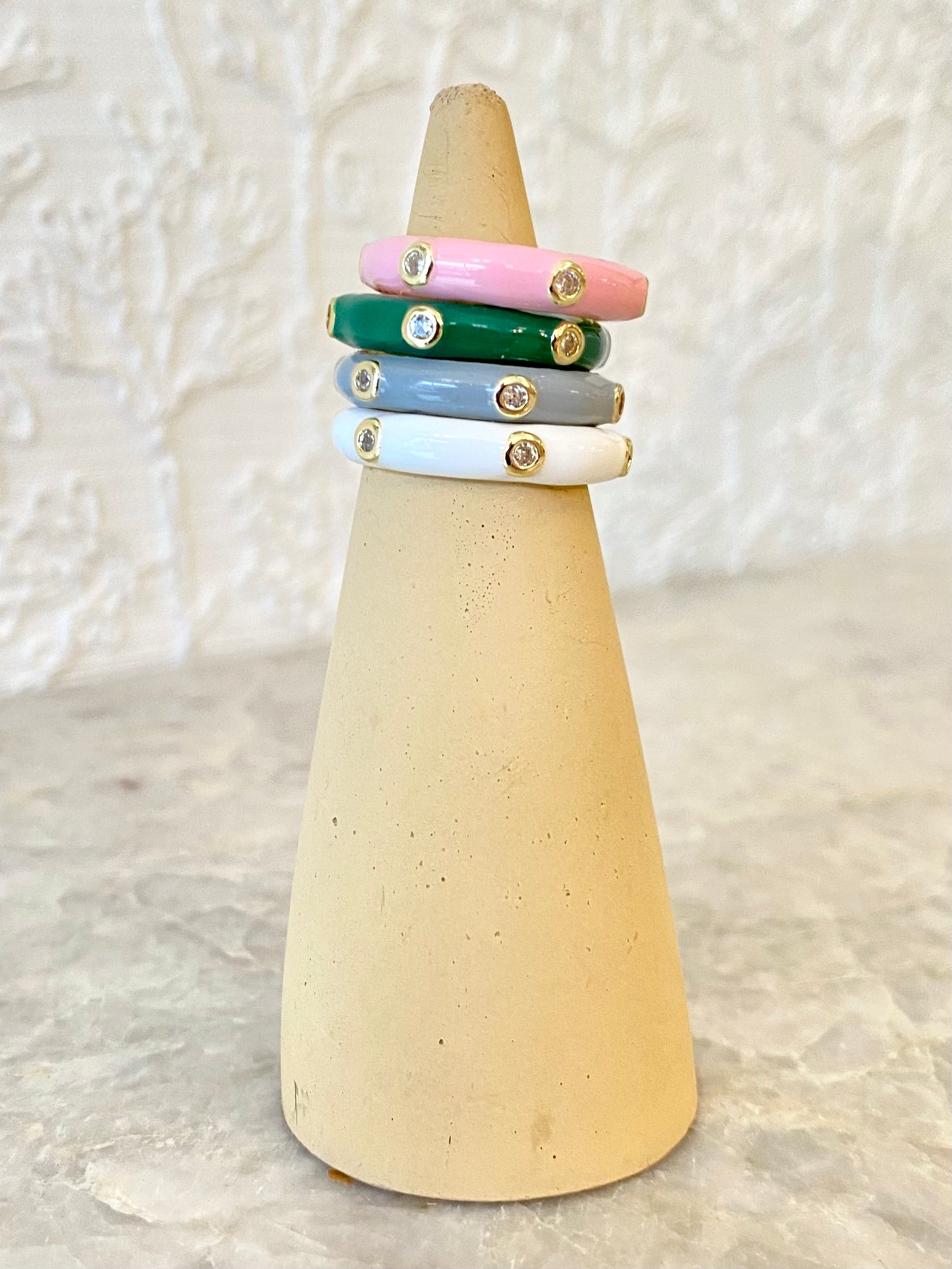 • elevate your style with these luxurious and sophisticated gold filled colorful enamel rings, featuring clear, round bezel set cubic zirconia stones