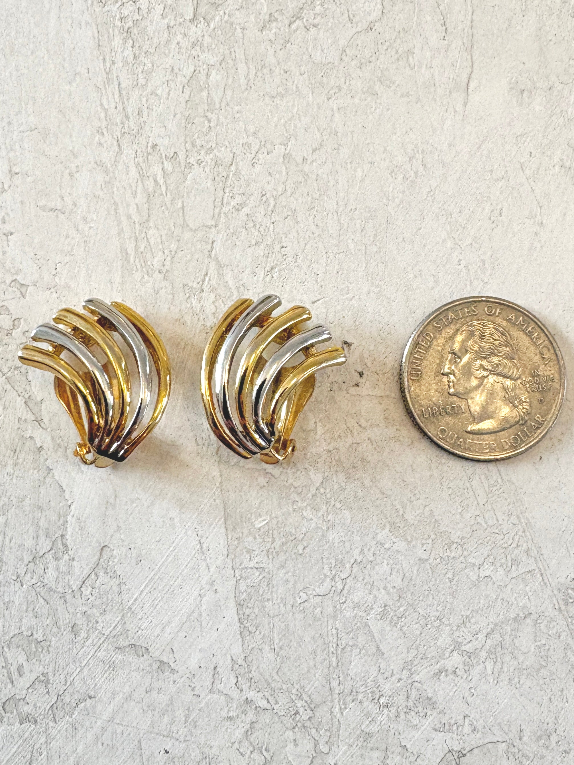 Gold Tone Mixed Metal Fan Clip On Earrings (Vintage)