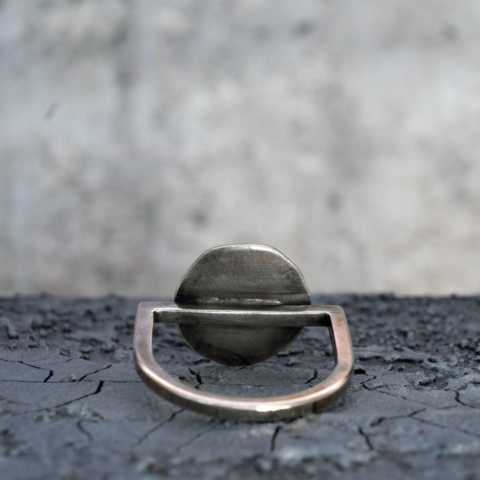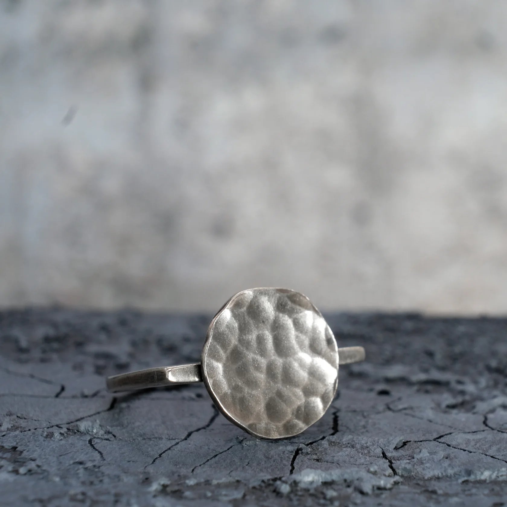 - One of a kind handmade sterling silver "D" style ring with hammered disc.