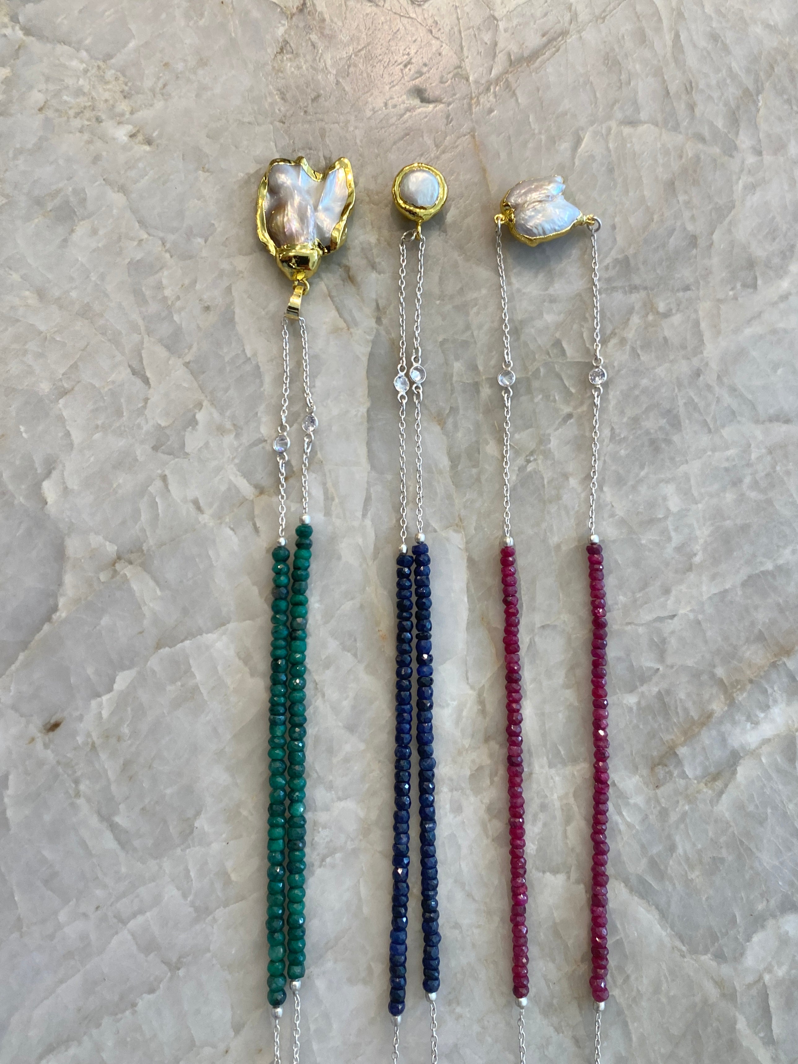 Long Natural Precious Gemstone Silver Necklaces in Multiple Colors w/ Fresh Water Pearls