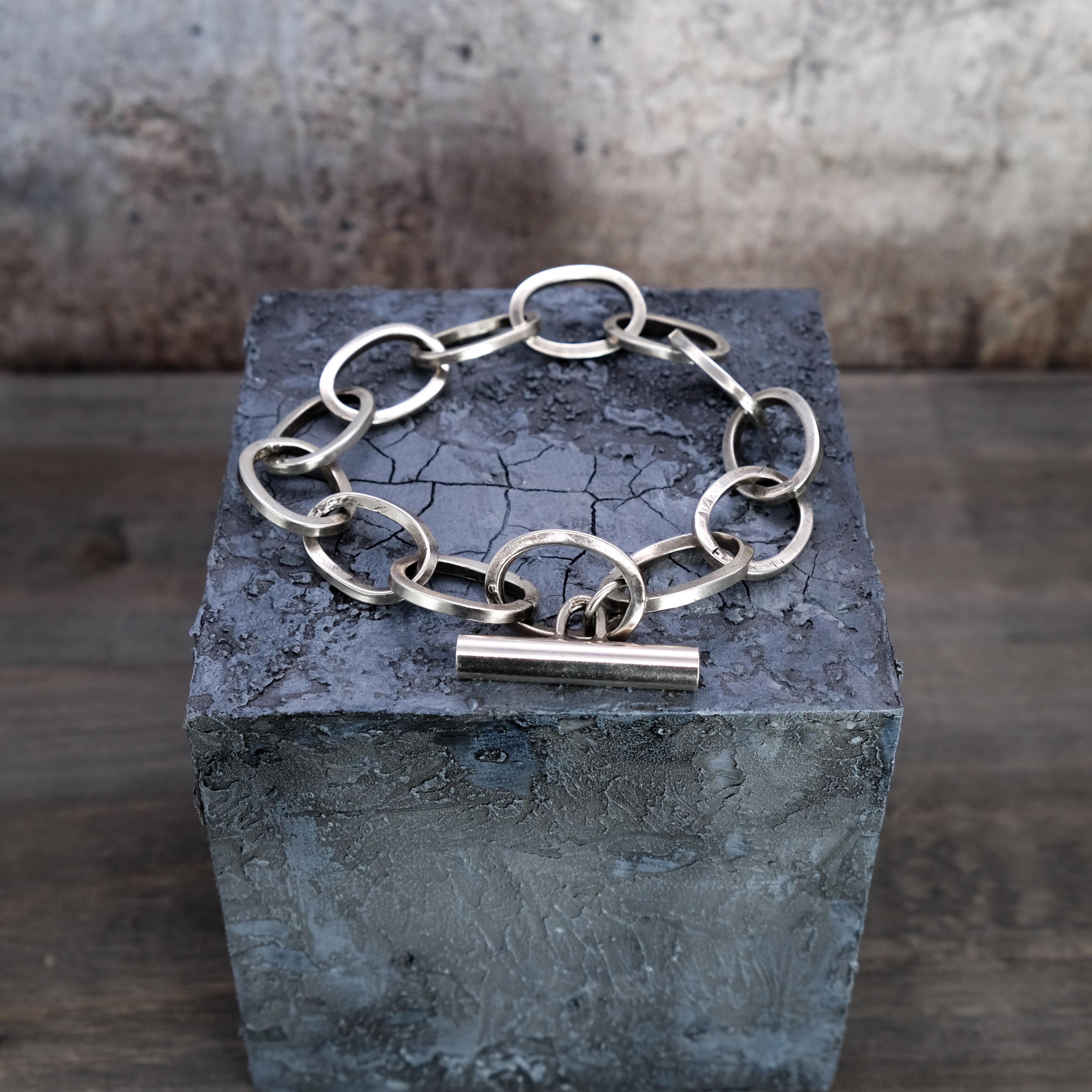 - Hand fabricated solid sterling silver heavy chain bracelet with massive hand soldered links and toggle clasp.