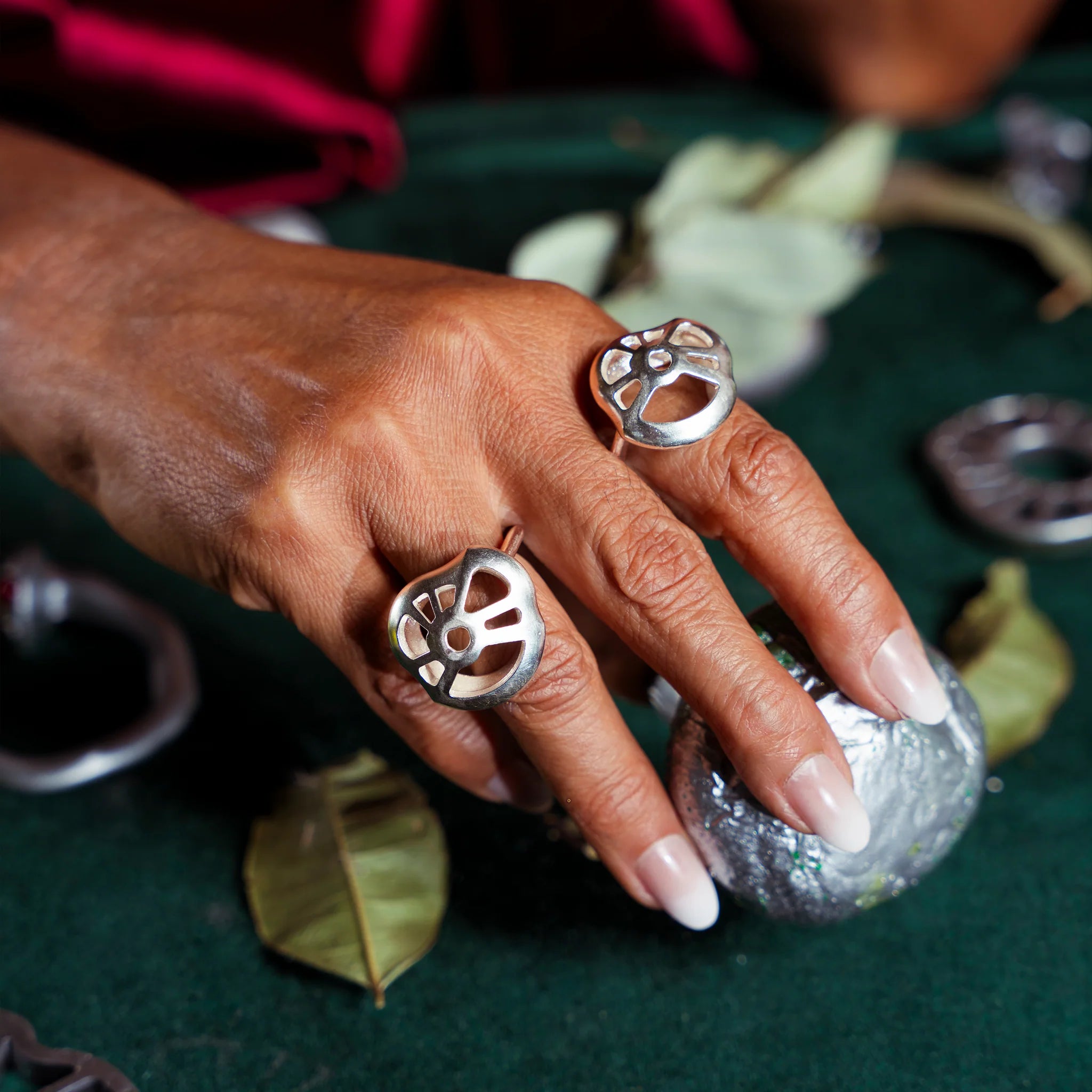 The design of this Mush Holes Ring embraces sustainability. Its prototype employs 3D technology to reduce wax waste and is made from recycled materials, including silver sourced from electronics, x-ray films, old jewelry, and various other reclaimed materials.