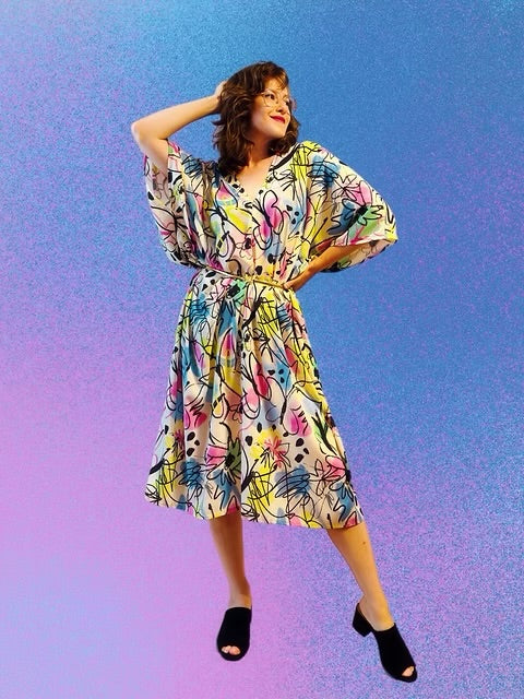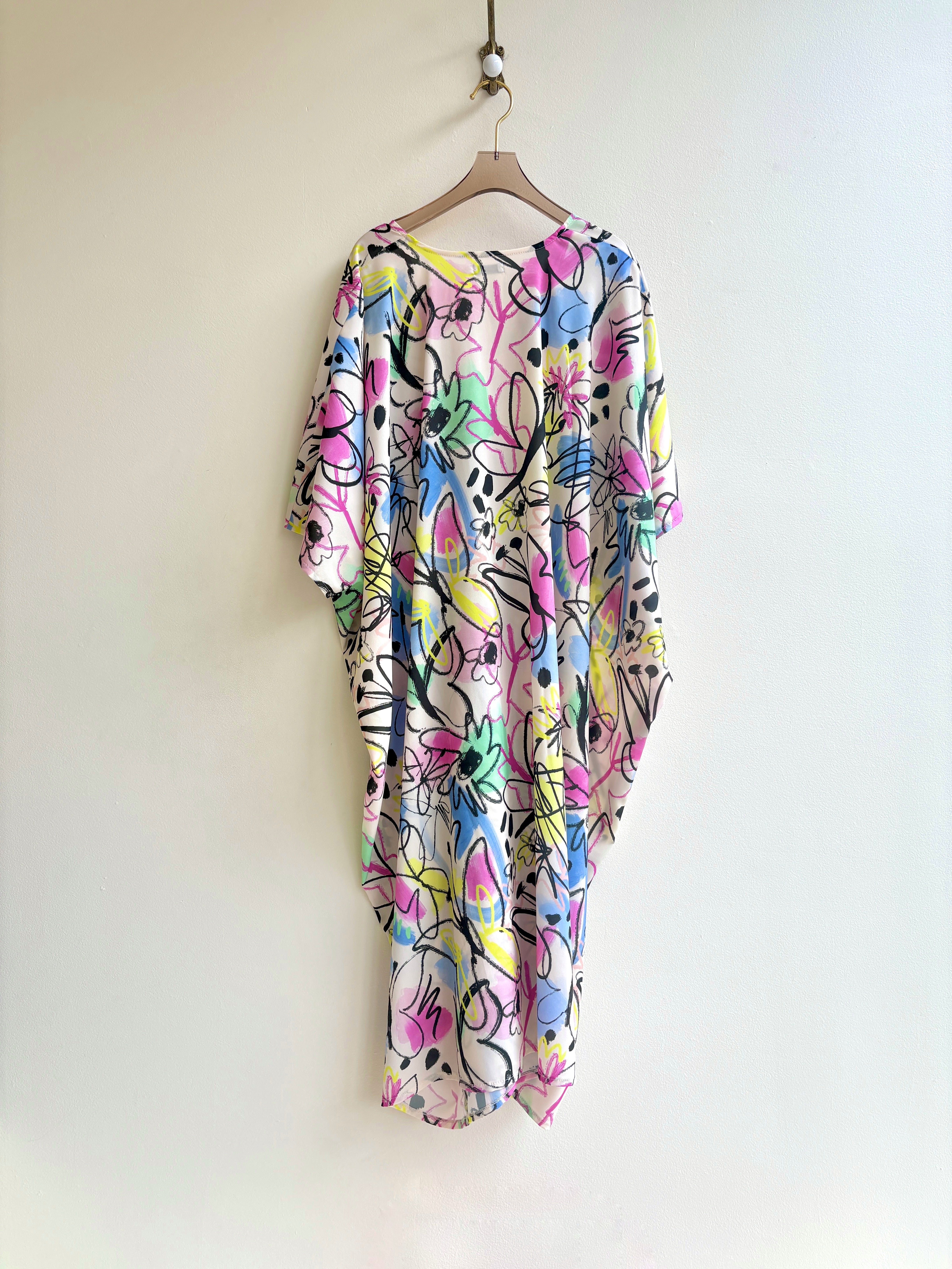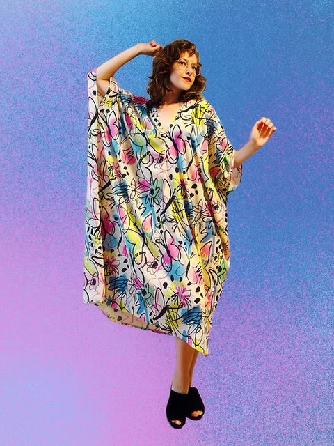 Who doesn't love a caftan moment? This ELECTRIC BUTTERFLY printed dress will have you floating through life, all the way from the pool to the dinner party! A simple yet sexy, loose cut, handmade in a silky poly crepe de chine material custom printed from Spoonflower. Versatile and oh so comfortable! Wear loose or belt it, dress it up or down!