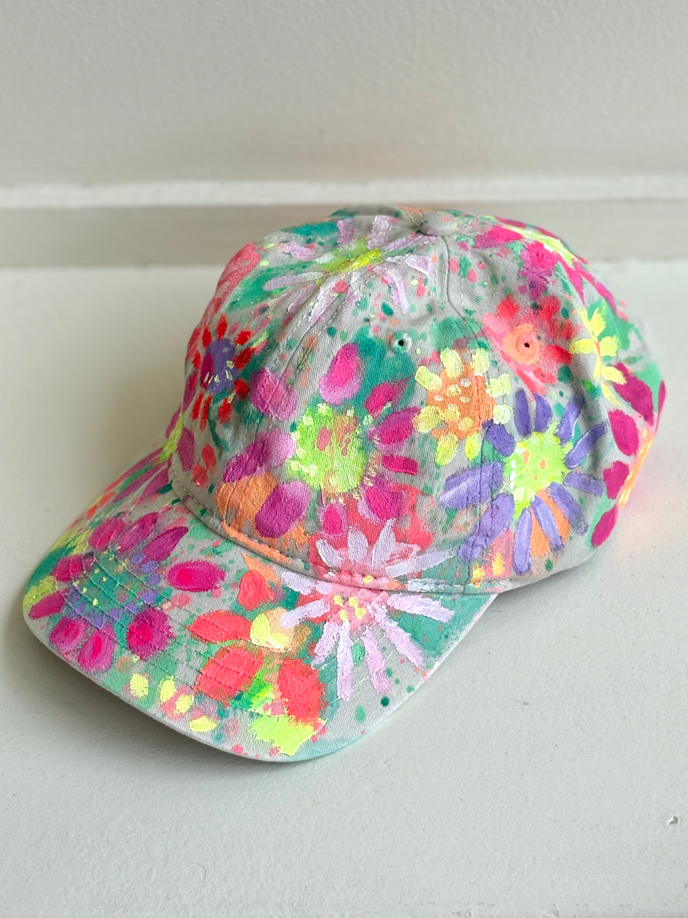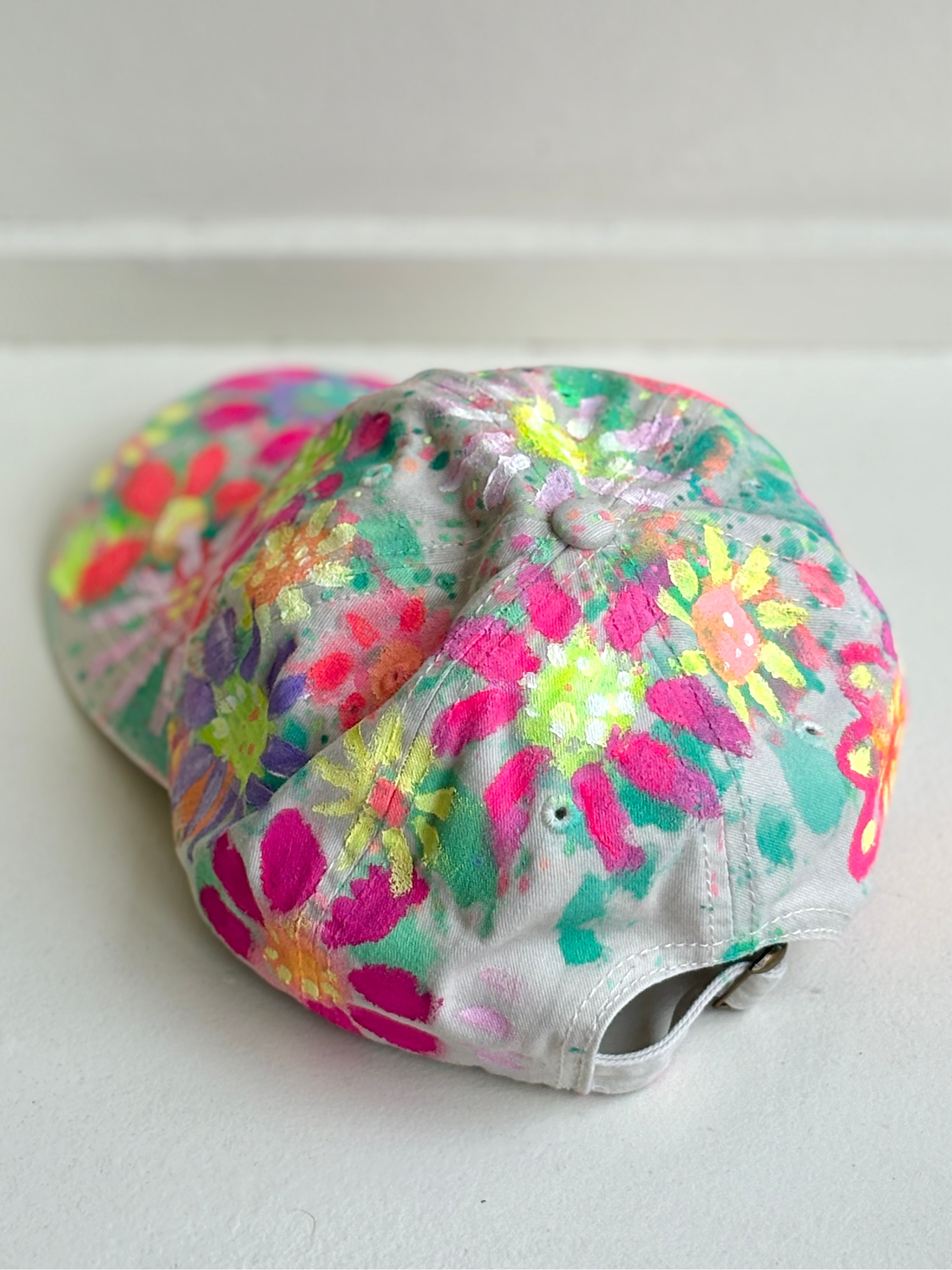 Natural Canvas Hand Painted Neon Pink & Purple Flowers Baseball Cap