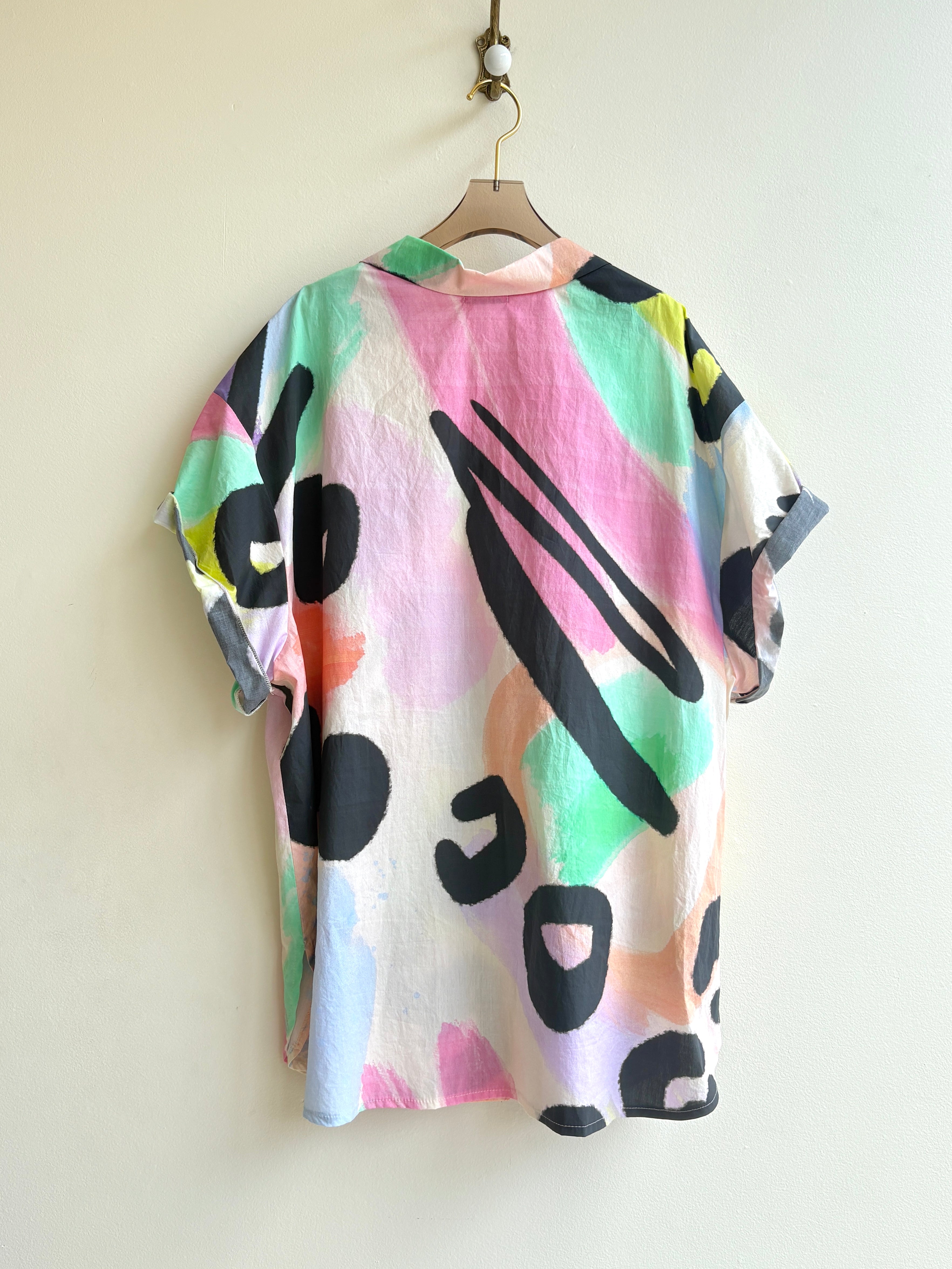 Juda Leah's version of a classic, oversized button down. Inspired by those cool, slightly crazy, shirts of the 1980's. Styled with wide, short rolled-up sleeves, finished with pink buttons because we want to have a little fun! Totally genderless, and can be styled in endless ways.