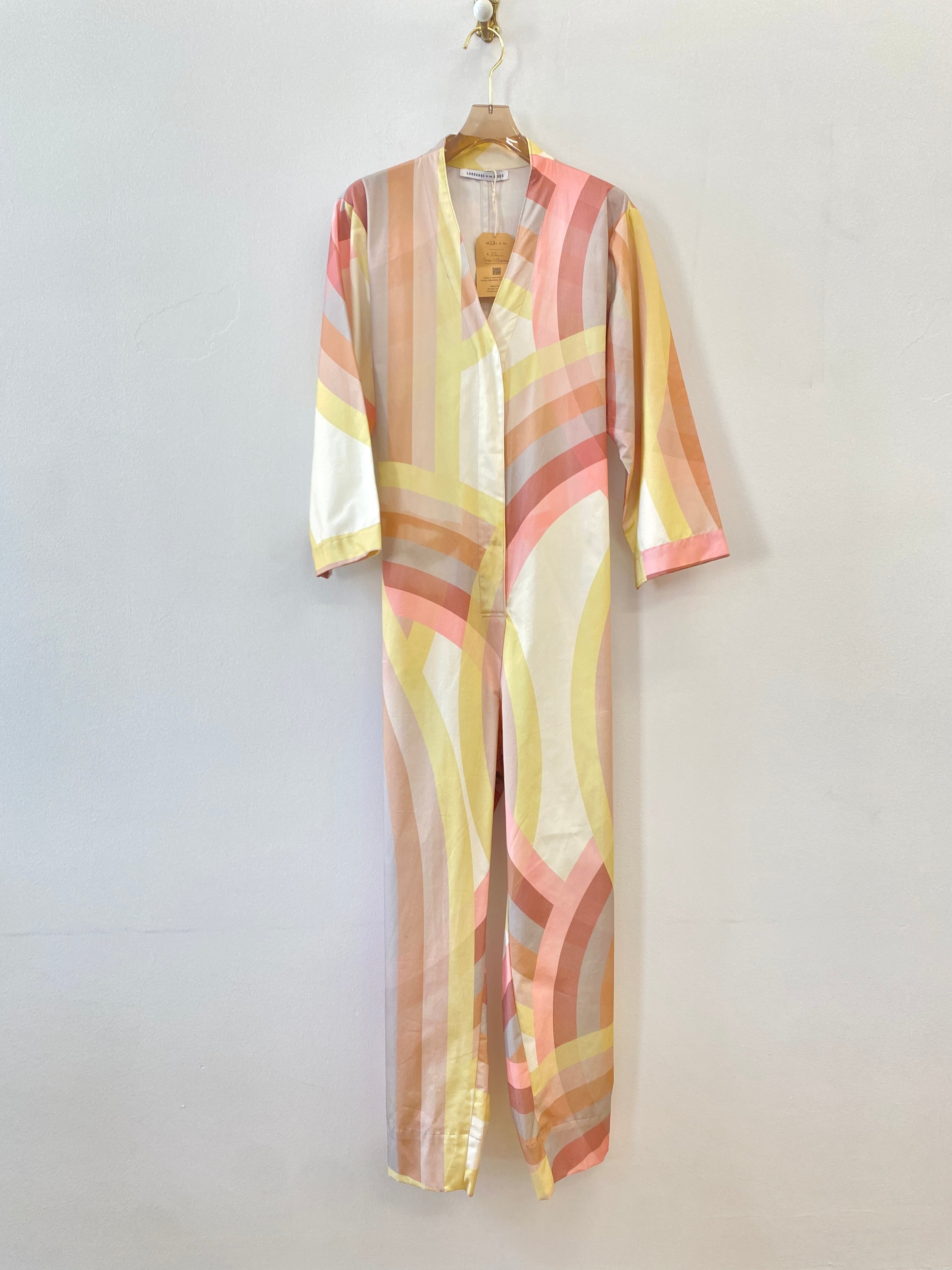 Crafted from a luxurious blend of linen and cotton, this jumpsuit is sure to make a statement. Boasting a slightly dropped crotch and back tie, a Nehru collar with snap front, and an on-seam pocket with top stitch detail, the jumpsuit can be styled in a loose, carefree manner or more tailored silhouette. An interior featuring flat felled back seam and sewn down facings adds an exquisite finish to this timeless "tea timer" playsuit look.
