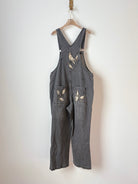 These black denim overalls are upcycled by Sherri Cohen Design. With hand drawn birds on the front and back, leaves decorate the legs and lower body.