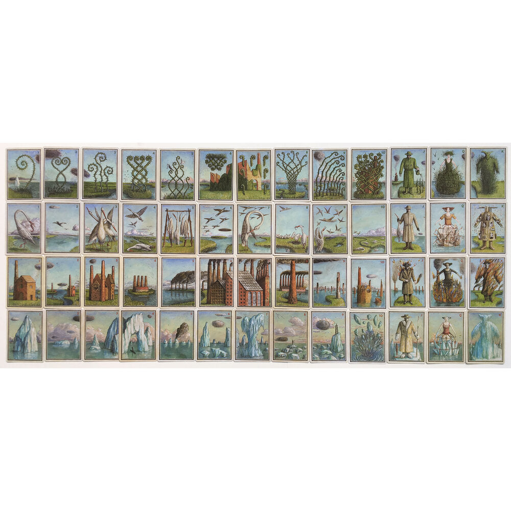 The commercial version of the panoramic Drowning World Poker Deck. The cards may be laid down end to end to form one continuously connected landscape. Printed on high quality playing card stock with curved corners for maximum durability. Includes the standard 52 cards found in a normal playing card deck, but the traditional suits have been replaced with weeds, birds, chimneys, and icebergs. Also included are two identical cautionary tale cards that may be used as jokers.