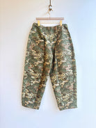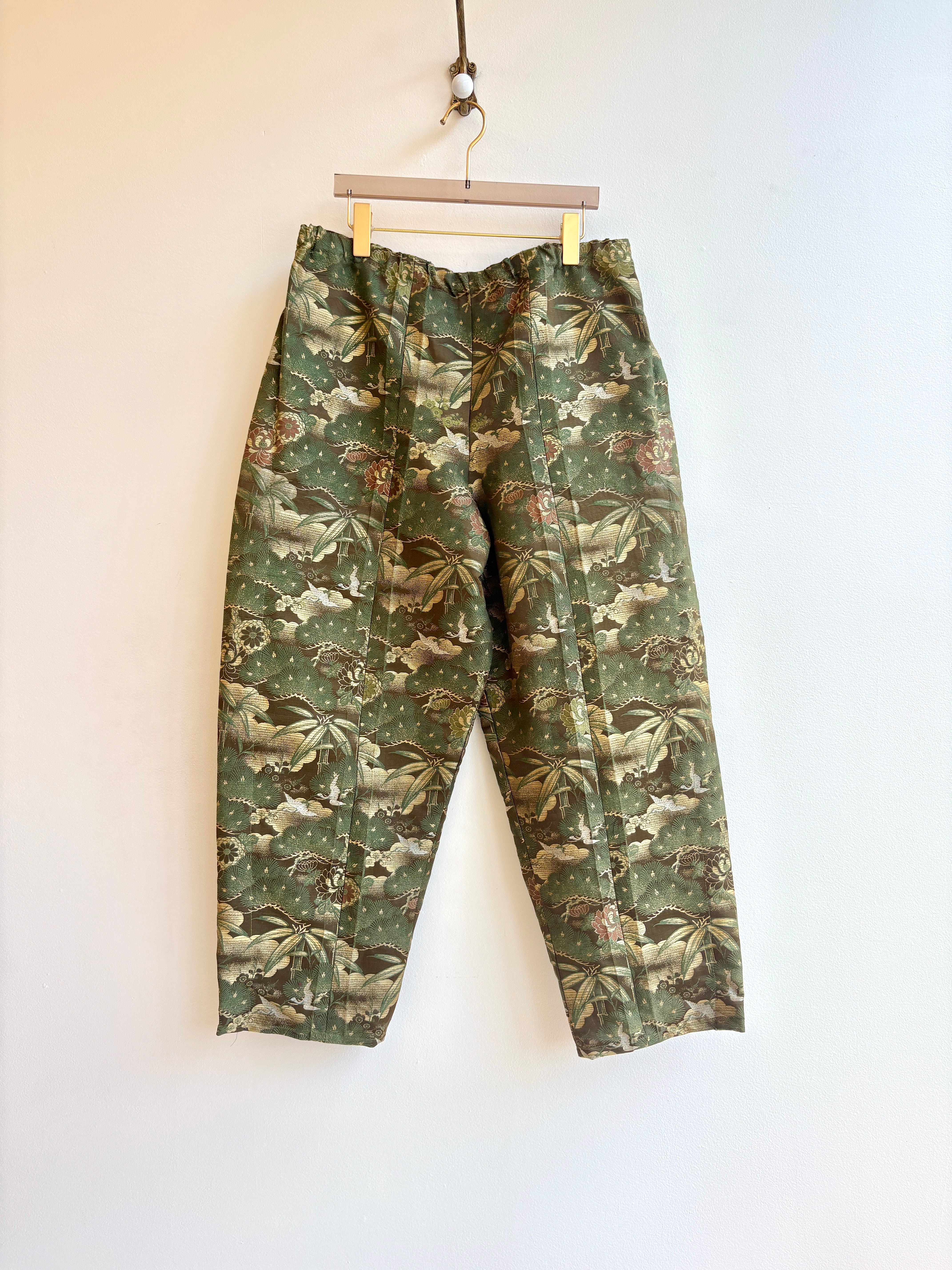 These vintage brocade pants from Kotulak are a fun play on a camo barrel pant. Made from a lotus flower woven fabric, they feature elastic in the back and front pockets.