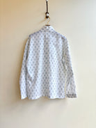 This soft cotton button down is made from vintage Yukata fabric by Kotulak. A crisp white cotton with a soft indigo woven floral pattern.