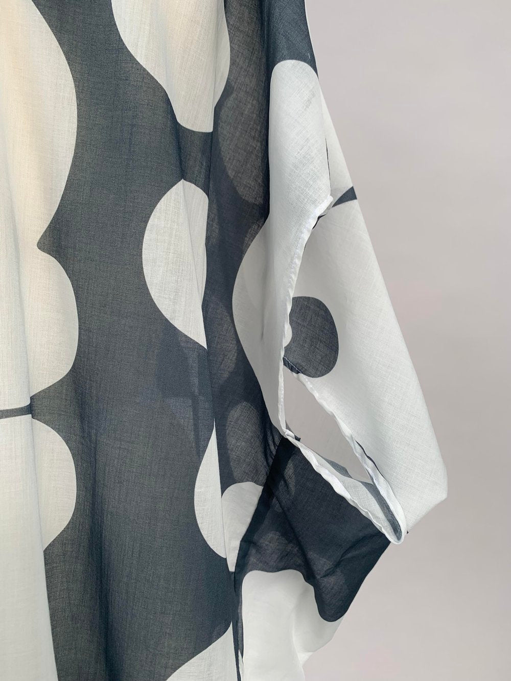 Cleverly shaped kaftan with V neck and draped body. Interior finishing includes flat felled back seam and sewn down facings. Midi length. One size. Due to the scale of the print, print placement varies on finished garments.