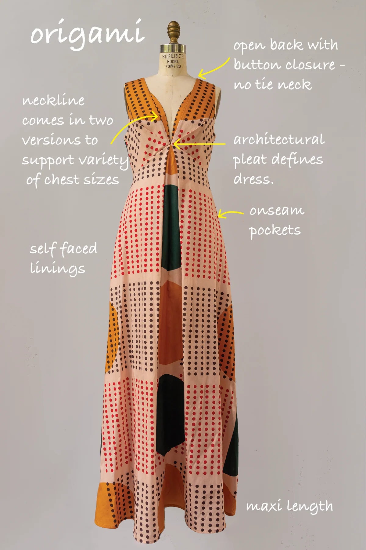 With a deep plunge in the front and open back, Origami by Language of the Birds is a special occasion dress for any time you need to make an entrance. Lined skirt and very comfortable back closure make this dress surprisingly easy to wear. Carefully designed with the right combination of insouciance and glamour.