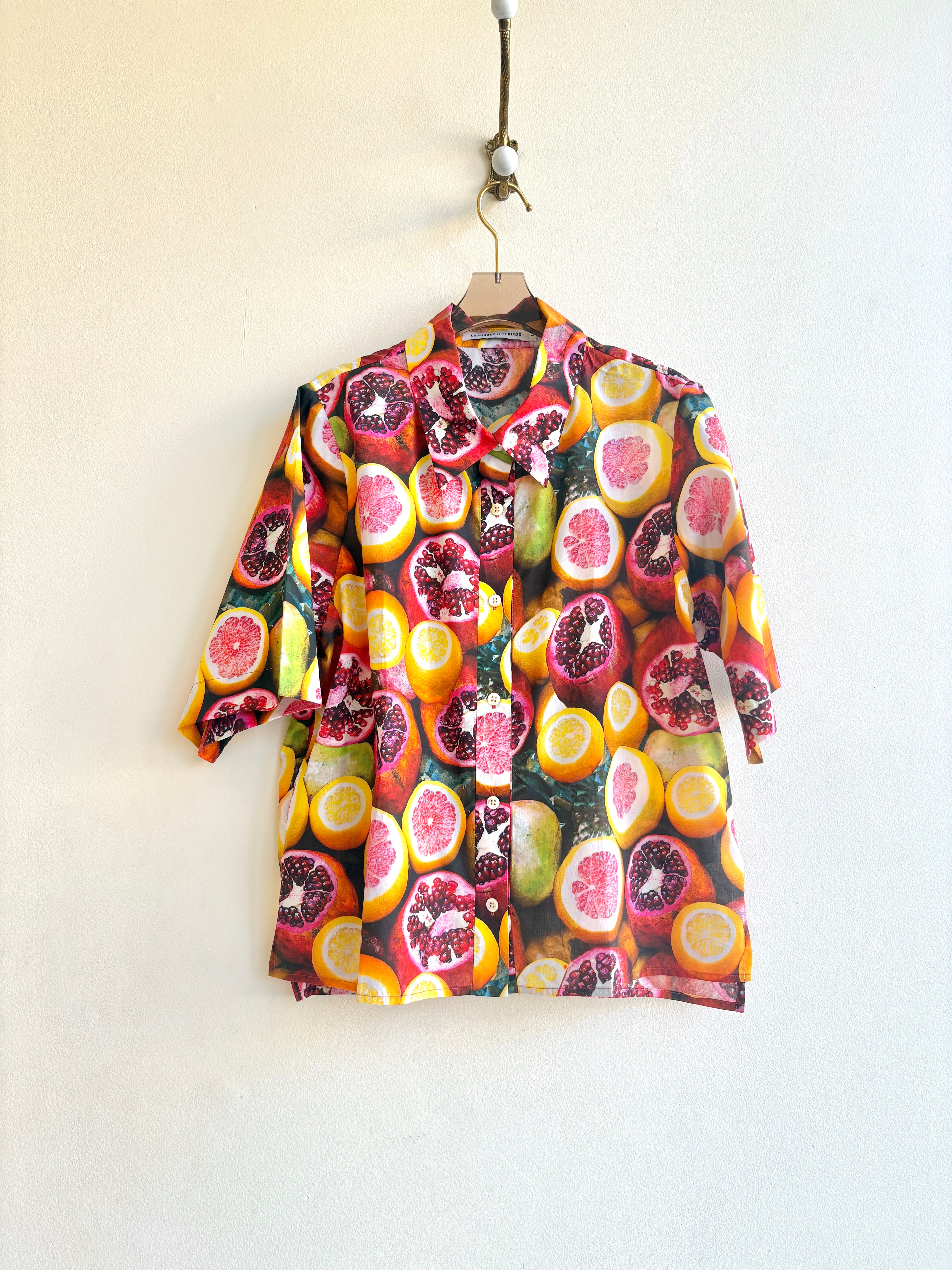 After years of looking for the perfect aloha shirt we patterned one from the ground up. This shirt has a boxy oversized fit, straight tabbed hem, shell buttons placed at intervals so the shirt can be unbuttoned without worry undergarments. Completely unfussy and not feminized. No pockets to break up the print. No back yoke.